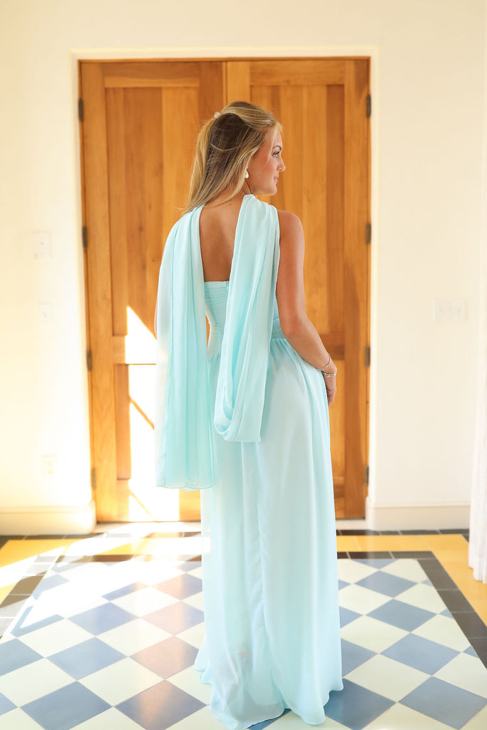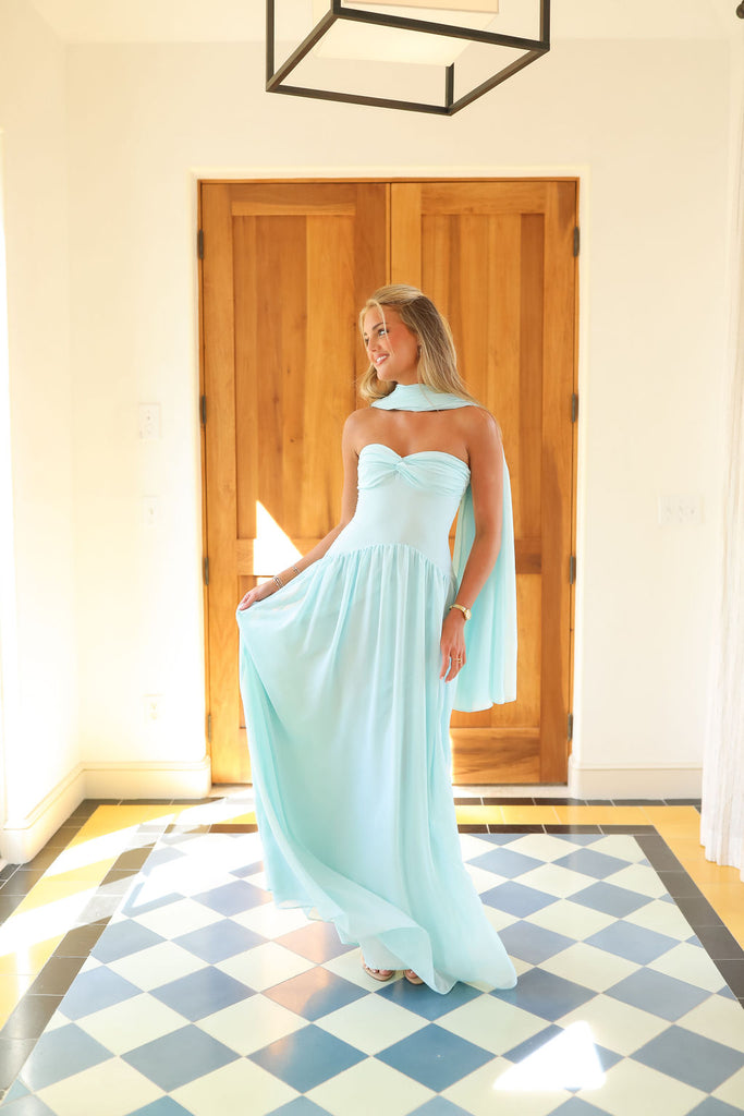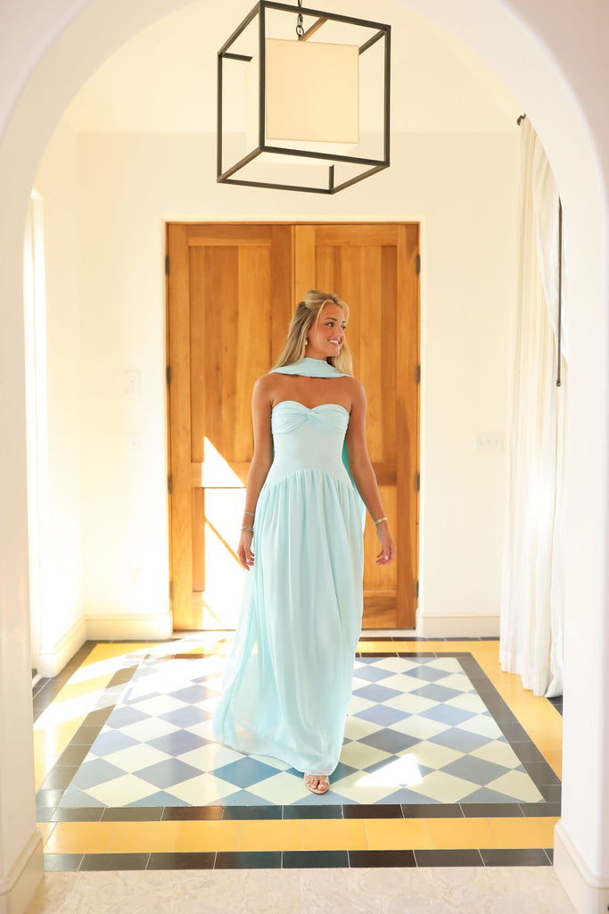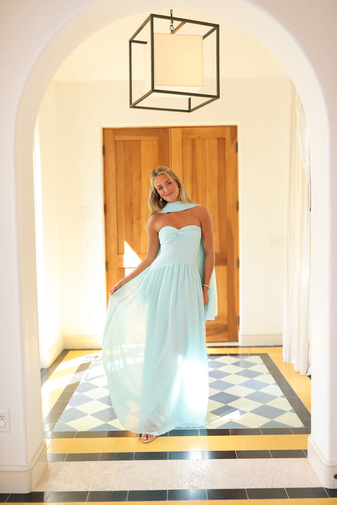 This strapless dress comes with a matching scarf and is available in four colors. Made from chiffon material, it also offers a comfortable stretch. Perfect for any special event!