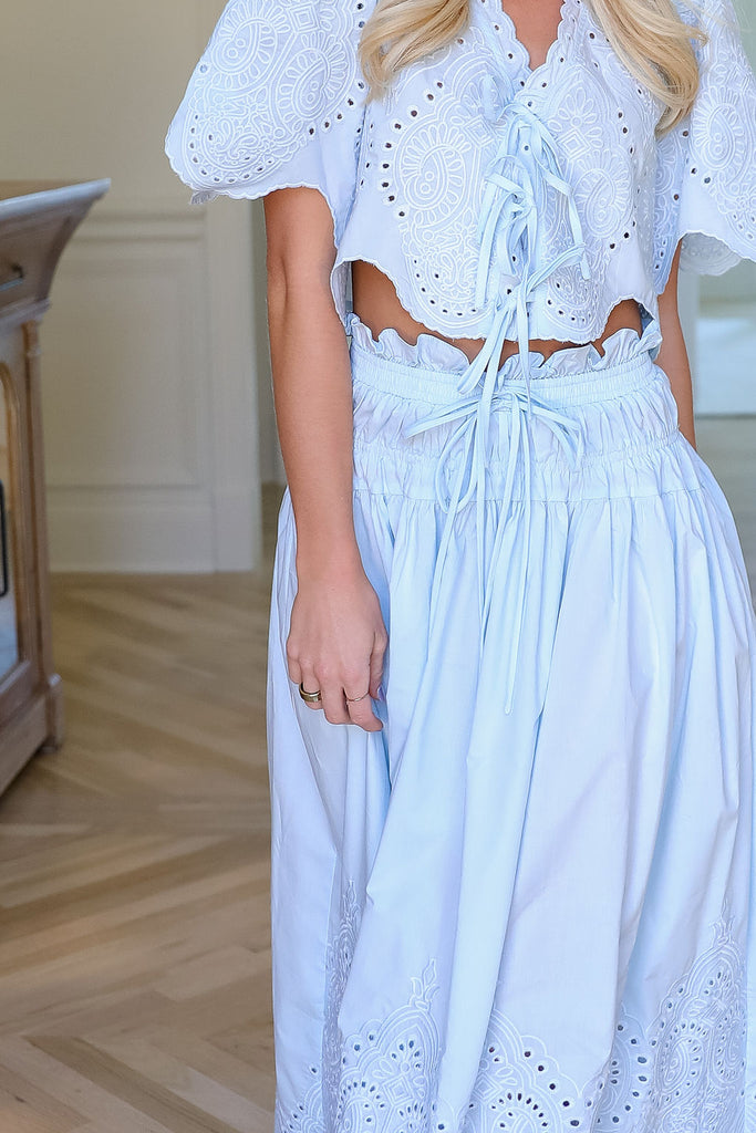 Crafted from quality cotton poplin, this midi skirt features delicate embroidery for a touch of luxury.
