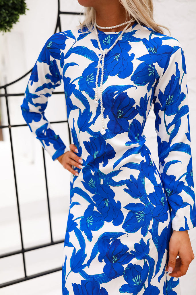 Featuring a high neck and long sleeves for an elegant silhouette. The stunning blue floral print adds a bold yet refined touch, making this dress perfect for occasions when you want to stand out with sophisticated style.