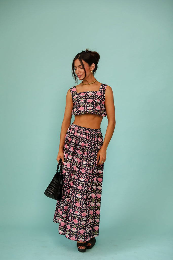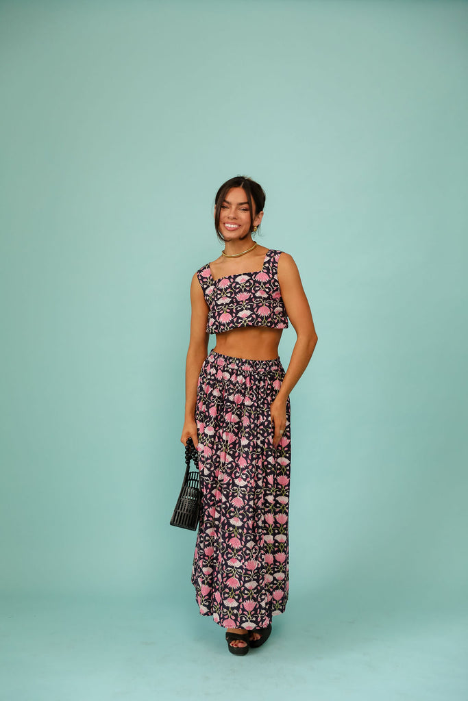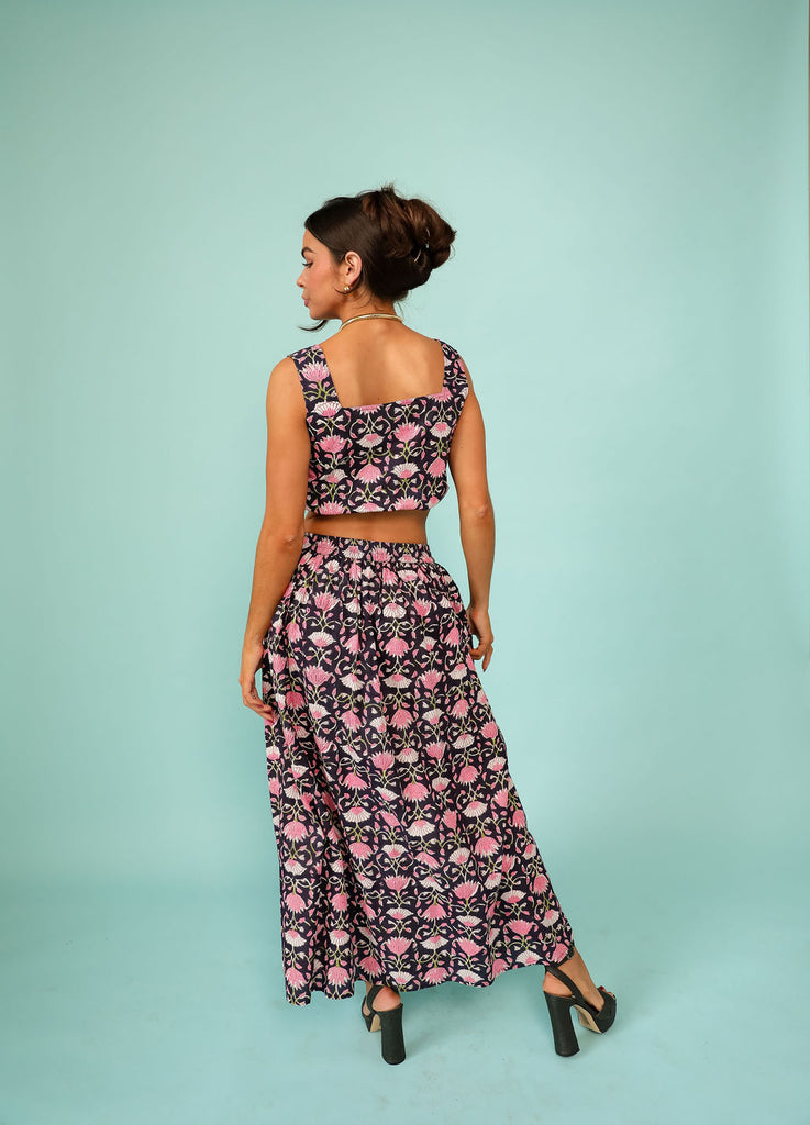Stunning block print pink Chocolate floral two-piece set featuring a cropped top and maxi skirt in 100% 100% cotton block print.