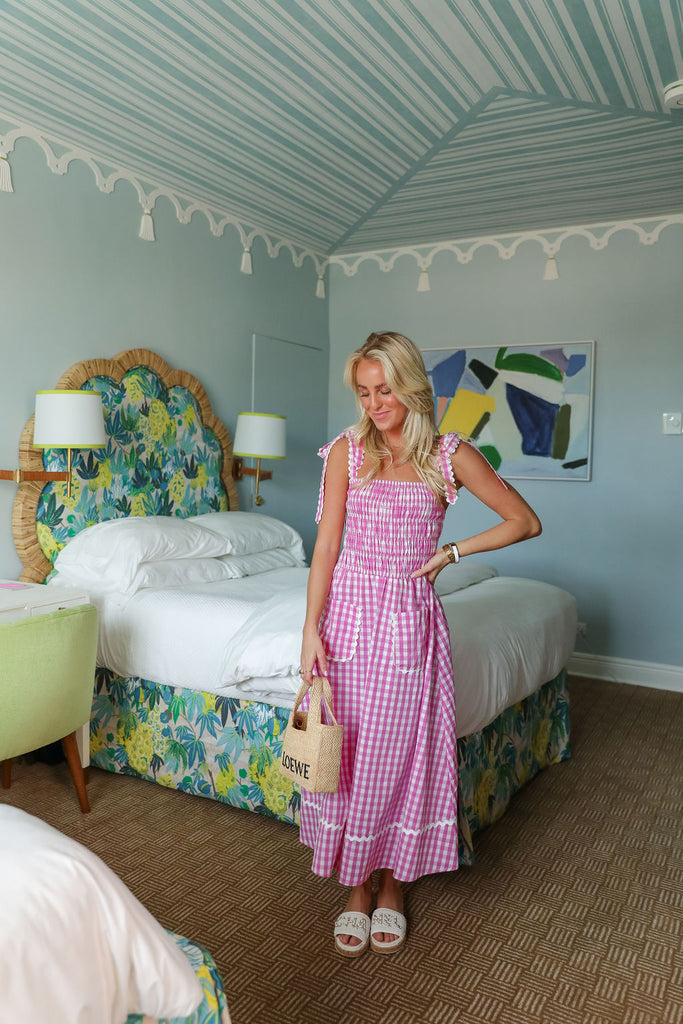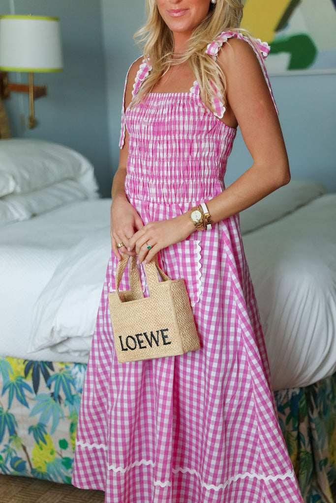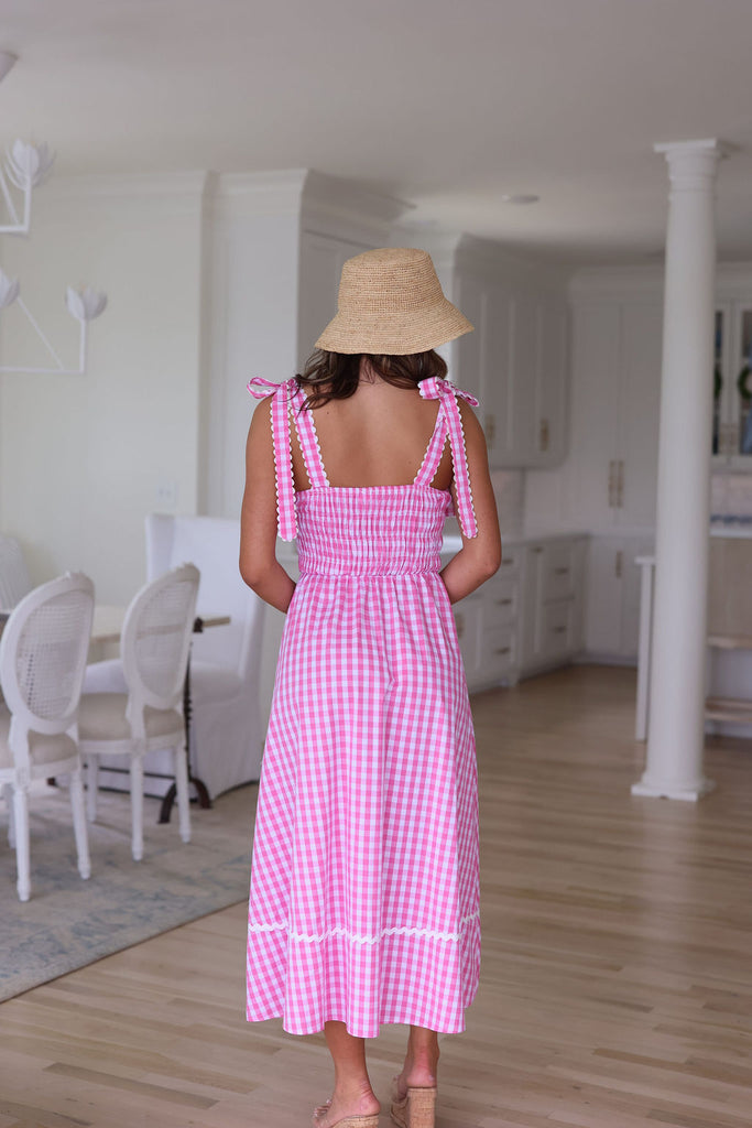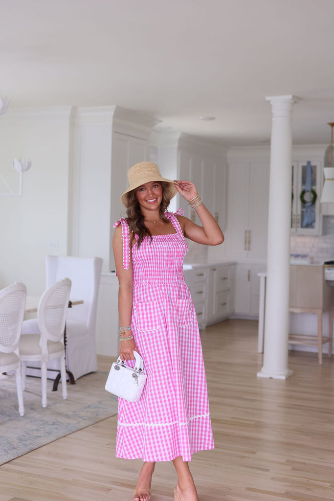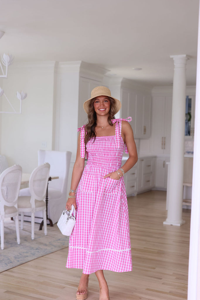 Perfect for a sunny day out, this dress features pink and white gingham print, adjustable tie straps, and a smocked bodice for a flattering fit.