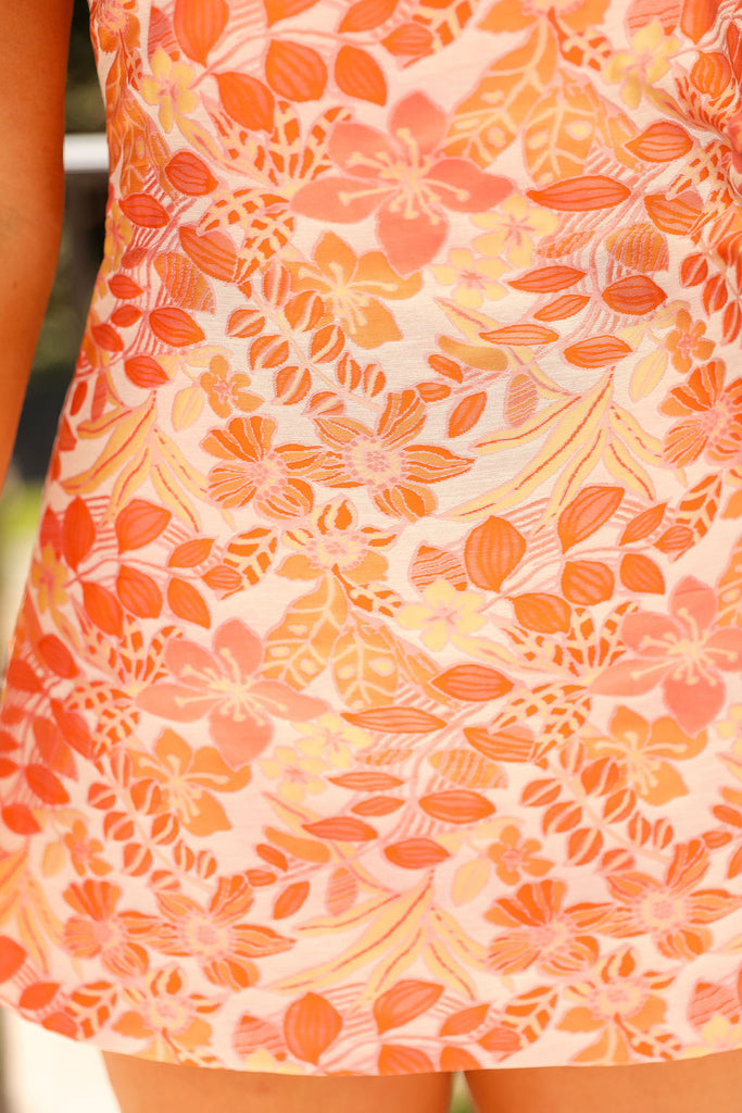 This sleeveless mini offers elegance with charming fall-inspired hues. Its delicate silhouette highlights your figure while the warm, seasonal colors add a refined touch to your wardrobe.