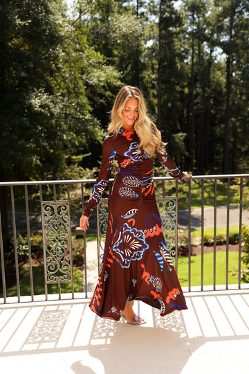 Make a statement in this long sleeve fitted maxi, where rich dark brown meets a bold, vibrant print. Sleek and sophisticated with a burst of color!
