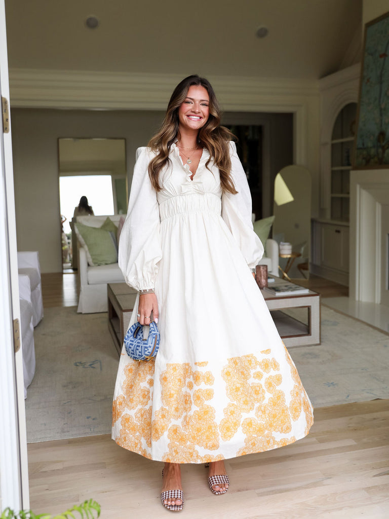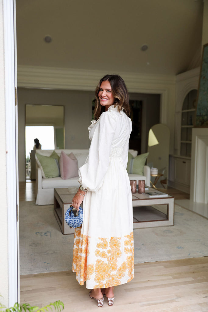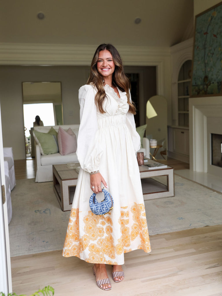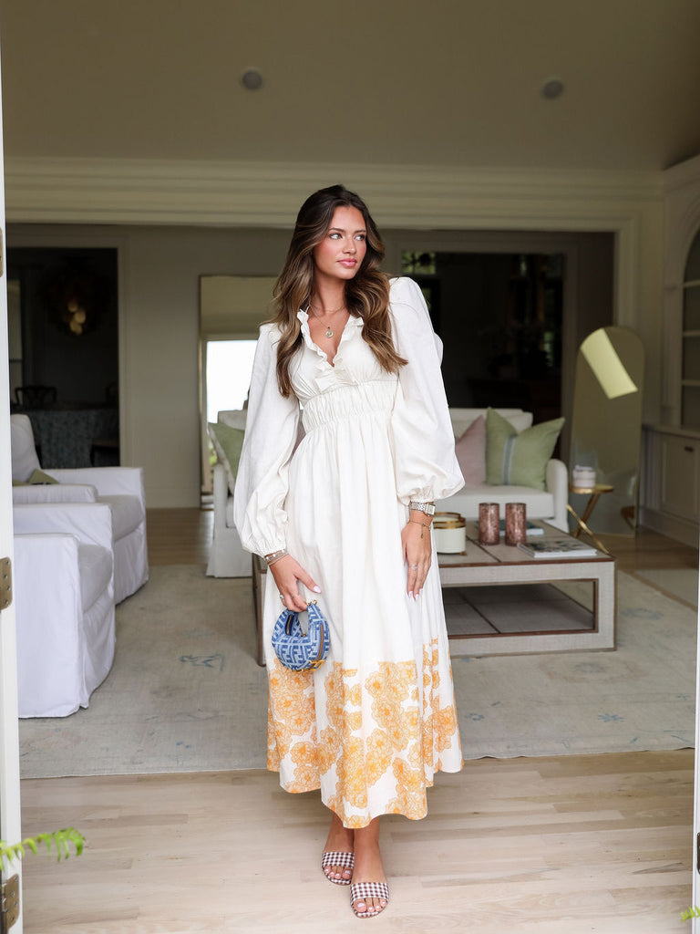 Softly structured with a touch of romance, this long sleeve midi dress features slight puff sleeves and a flattering V-neckline adorned with delicate ruffle detailing, finished with a gorgeous floral hem. The perfect blend of feminine charm and effortless elegance.100% cotton