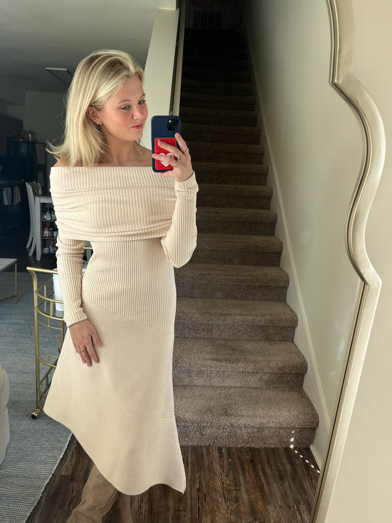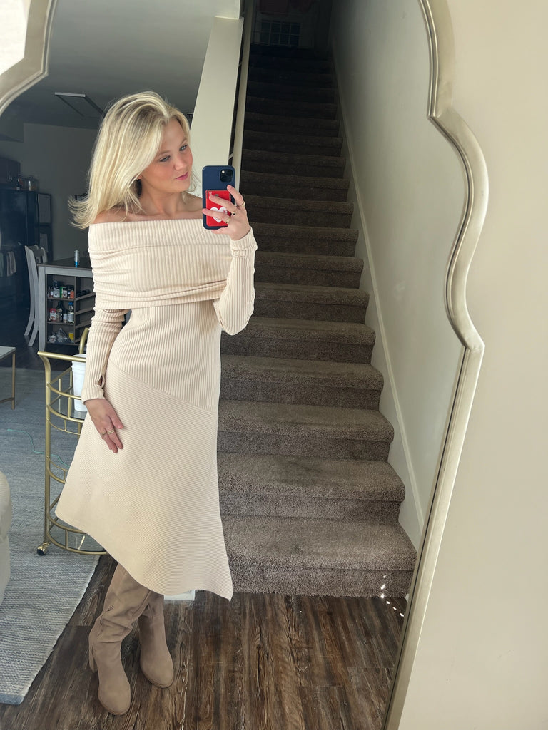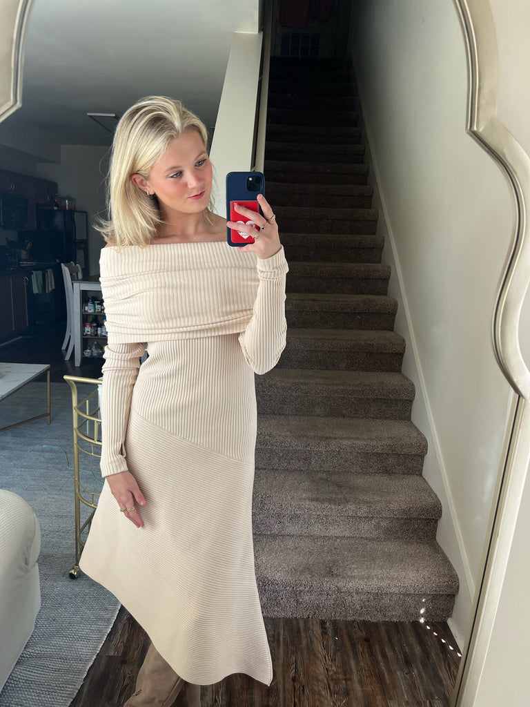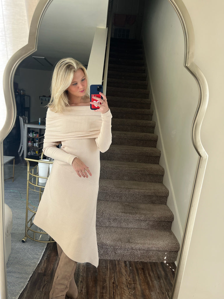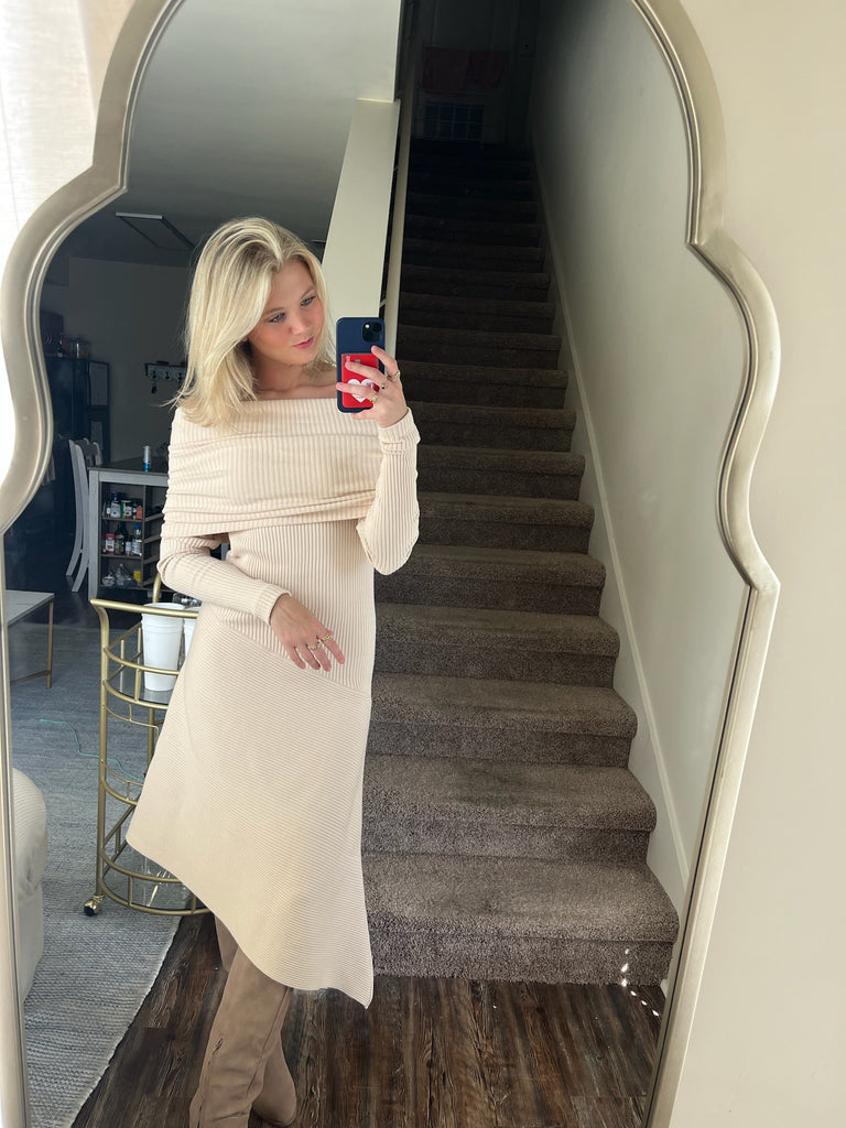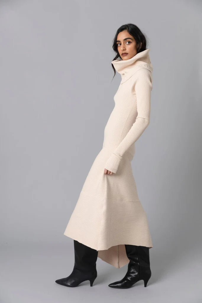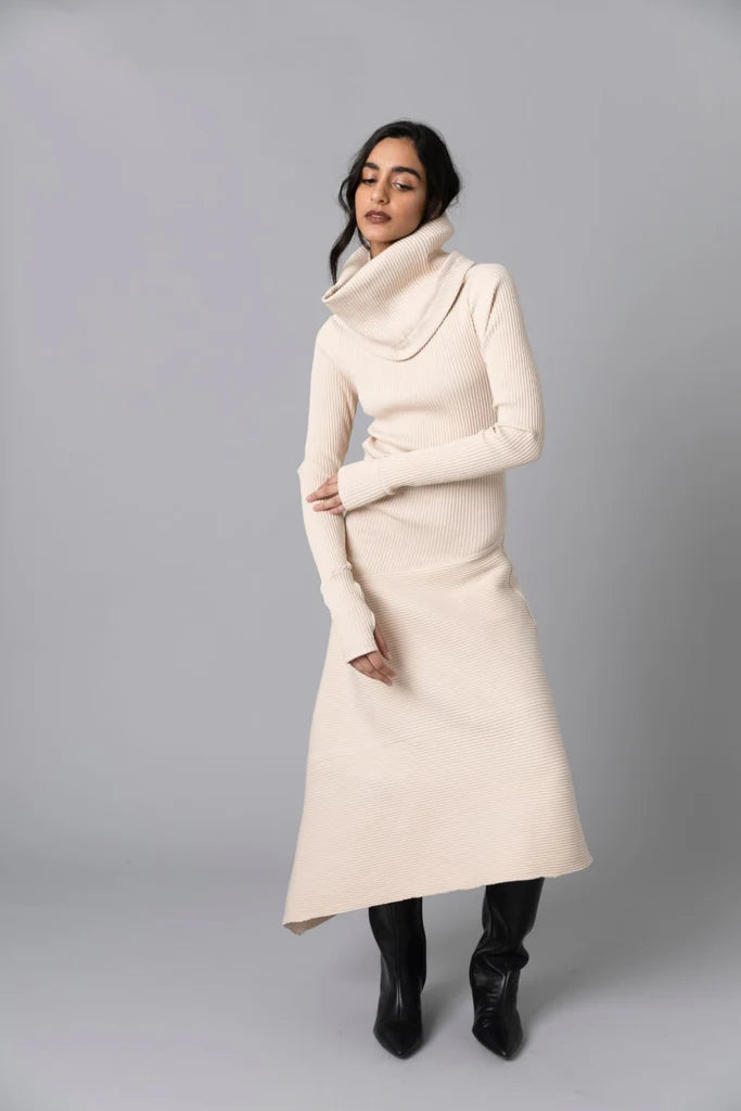 - Long sleeved dress has dramatic cowl collar and asymmetric skirt