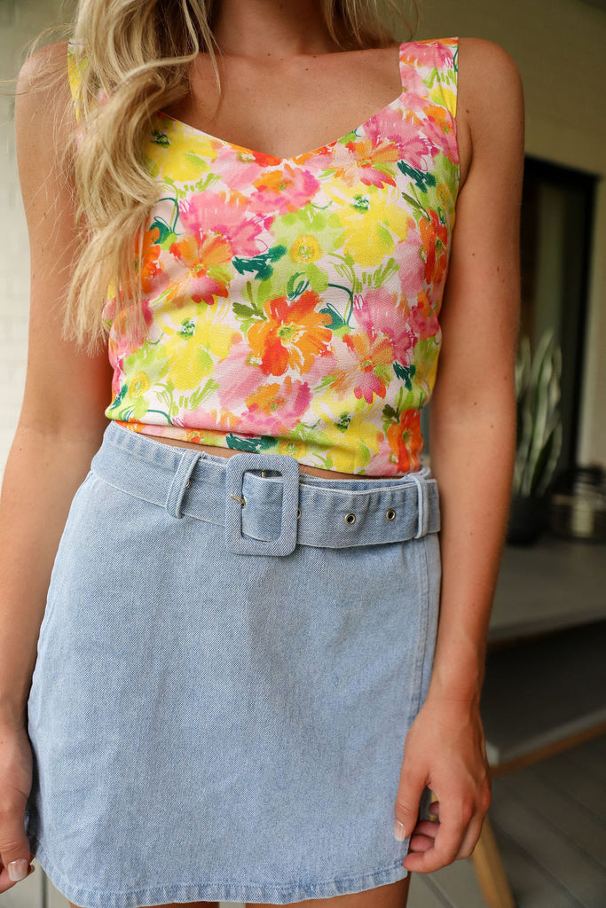 Beautiful in color and print, this multi colored tank features a sweetheart neckline and cropped length.