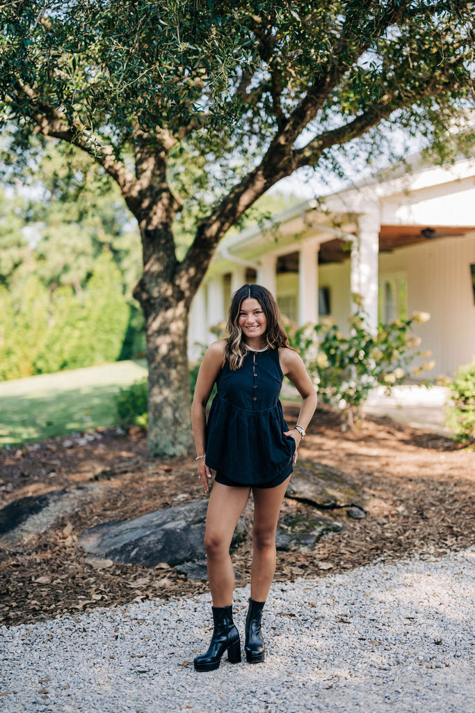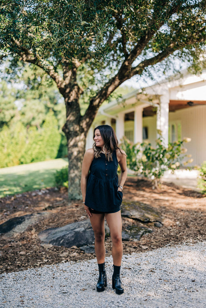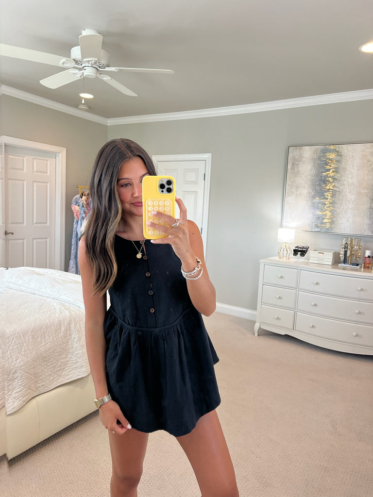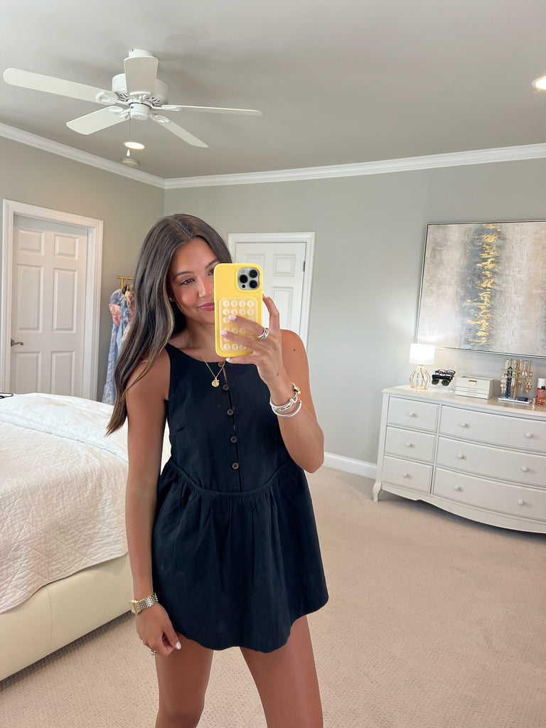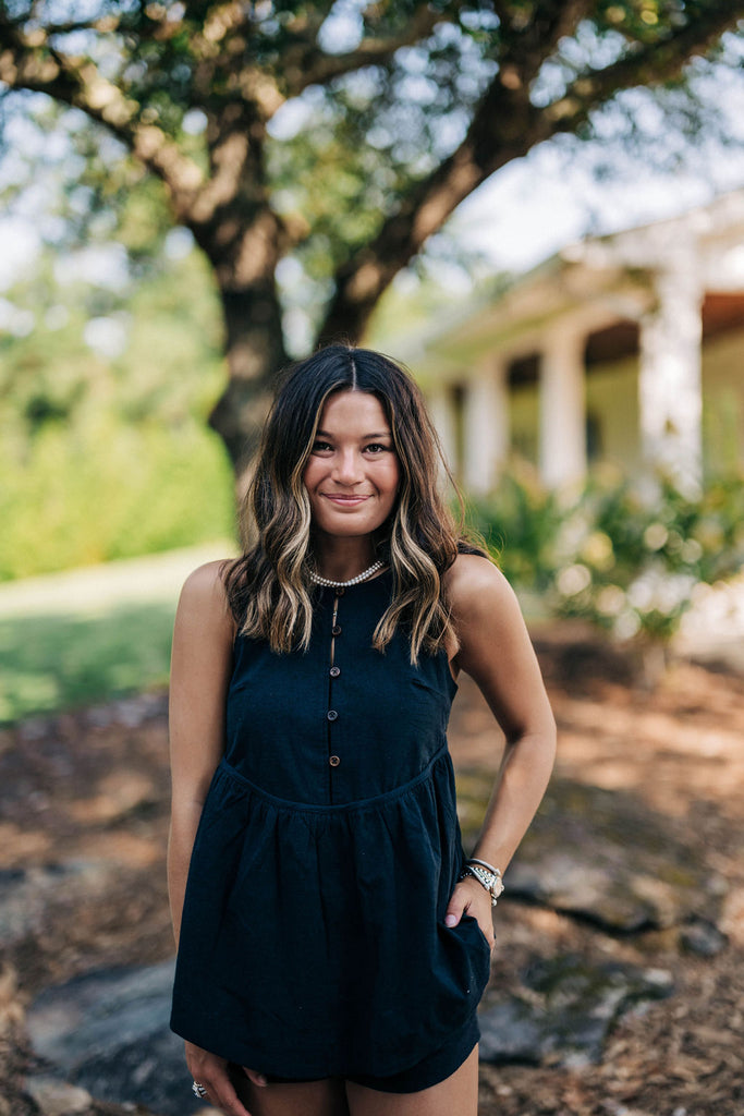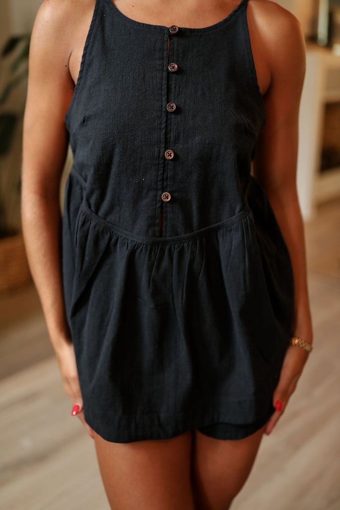Features: Soft cotton-linen blend, scoop-neckline, sleeveless-style with thin adjustable shoulder straps, low open-back, button-front closures, pockets for hands