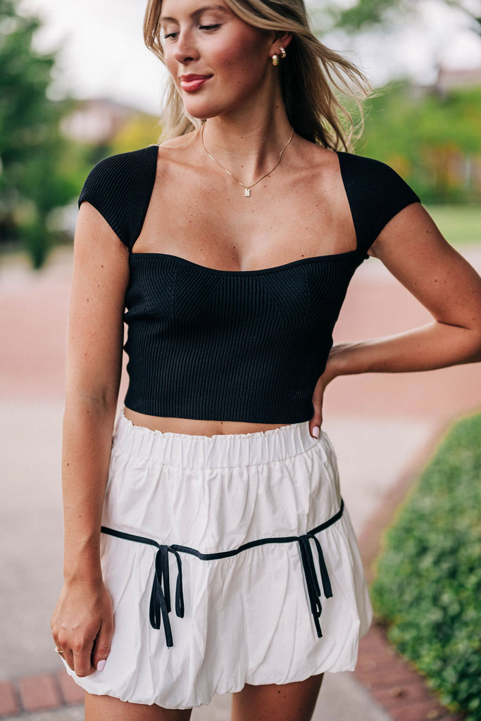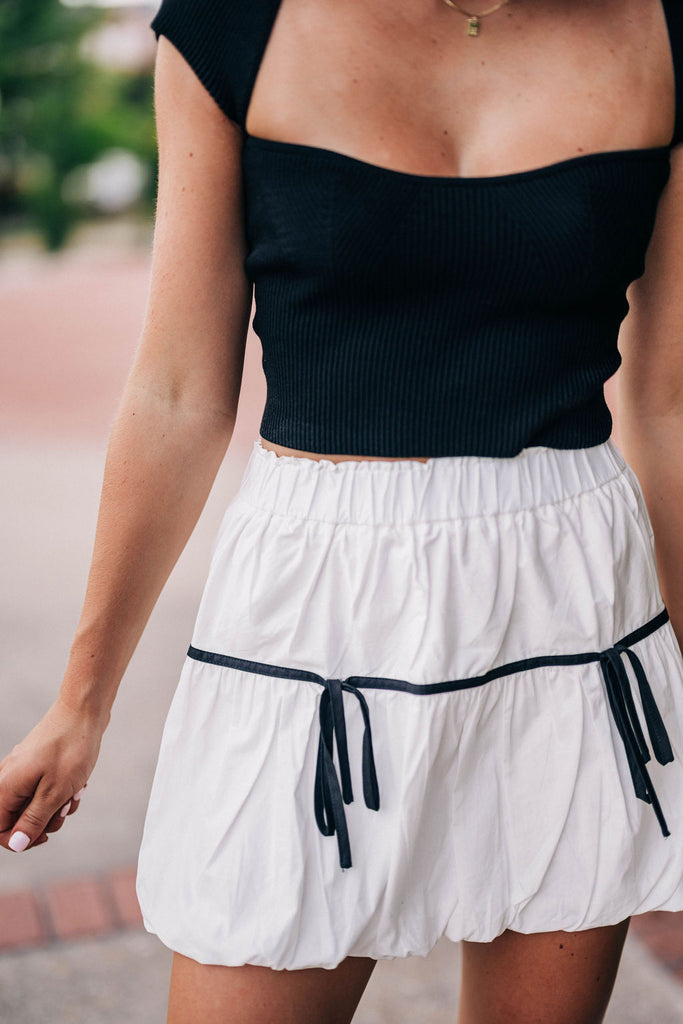 With its playful balloon hem and unique double tie detail, this mini skirt adds a touch of cuteness to any outfit. Available in two stylish color ways!