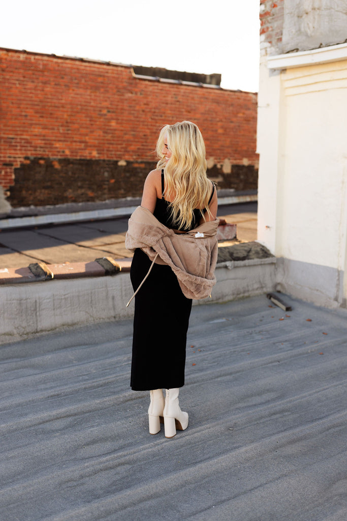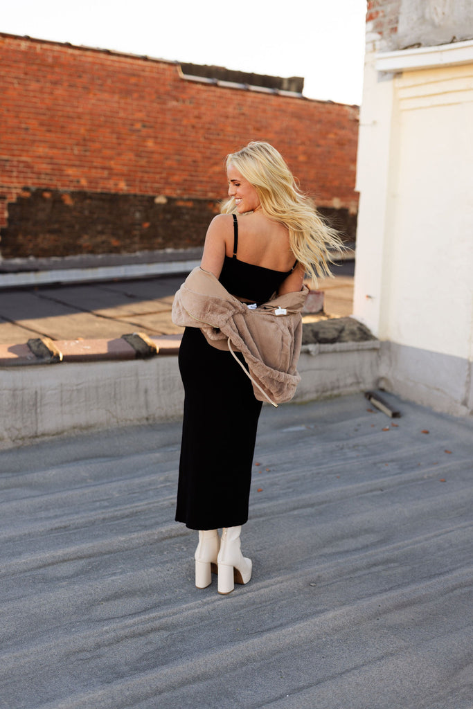 Sleek slim fitting two piece set in medium weight, elevated knit. A crop tank top with a square neck an adjustable straps, and a matching midi skirt with a high waisted fit, midi hem and front slit. Fully elasticize waist band for comfort.