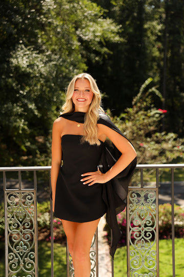This elegant strapless mini dress is crafted to highlight timeless sophistication. Available in two stunning colors, it features a sleek silhouette that flatters any figure. Included is a matching scarf to enhance your look with refined versatility, perfect for evening events or special occasions.