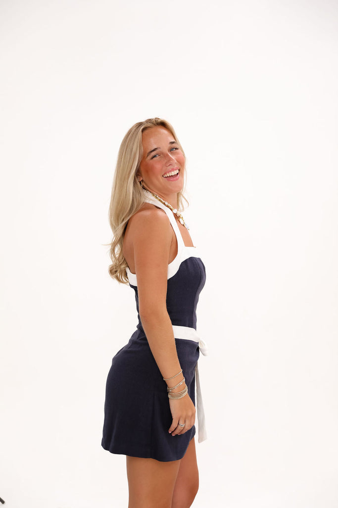 Elevate your summer wardrobe with this adorable mini, crafted from 100% breathable linen. This colorblock halter mini dress offers a refined silhouette that combines comfort with effortless style.