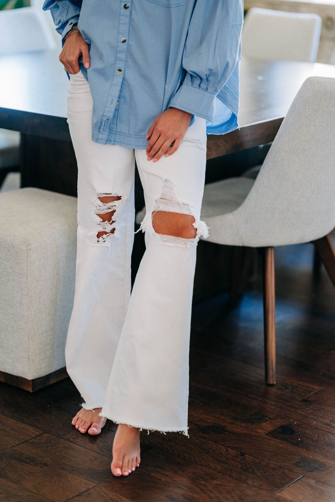 New High Waisted Hustler jeans are a must this season!!! Wide leg style with the perfect amount of distressing and in the color of the season- White. Pair these with anything and you are ready for a night out or favorite luncheon.