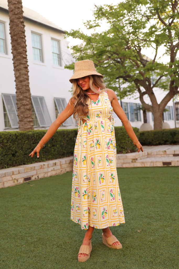 Make a statement with this breezy sleeveless midi dress, designed for effortless elegance. Featuring flattering side cutouts with adjustable tie details, this dress blends sophistication with a touch of playfulness. The lightweight fabric offers a flowy silhouette, making it an ideal choice for vacation getaways, brunch dates, or summer outings.
