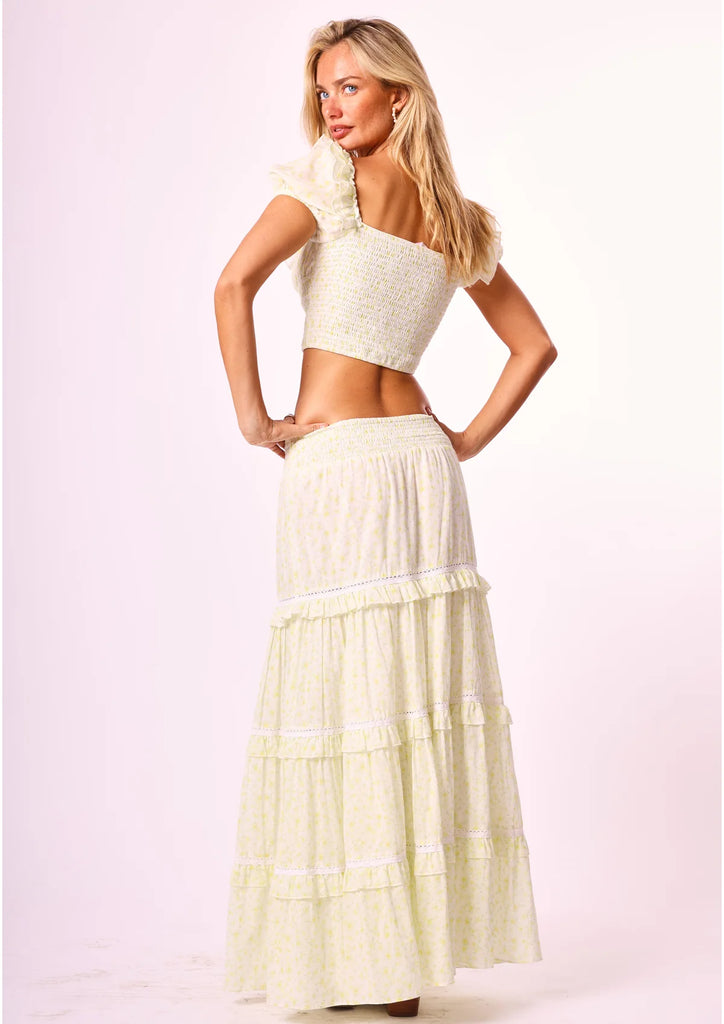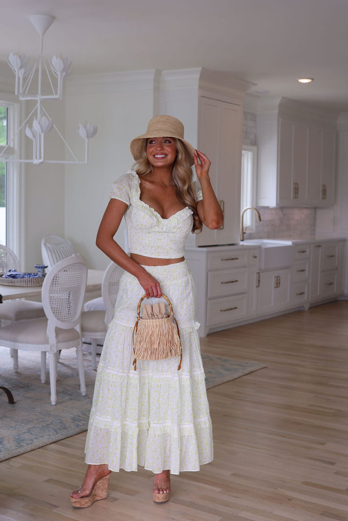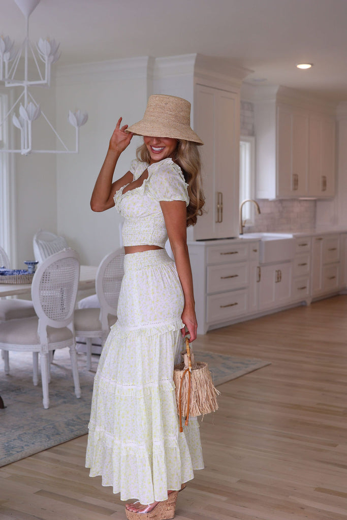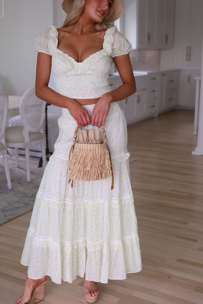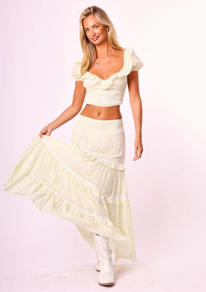 Introducing the Adeline set in wildflower, crafted in 100% lemon ditsy cotton. This set features a crop top with a sweetheart ruffled neckline, a shirred waistband and dainty puff sleeves. The maxi skirt is a fitted style with ruffle detailing, decorated with intricate lace details and an elasticated waistband. Runs large… We suggest sizing down.