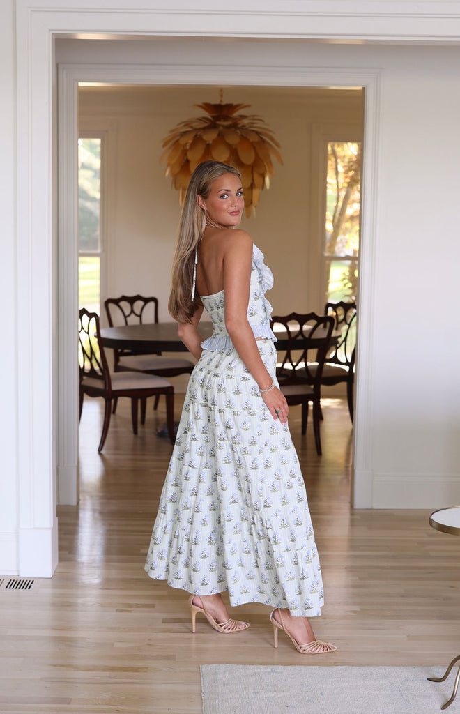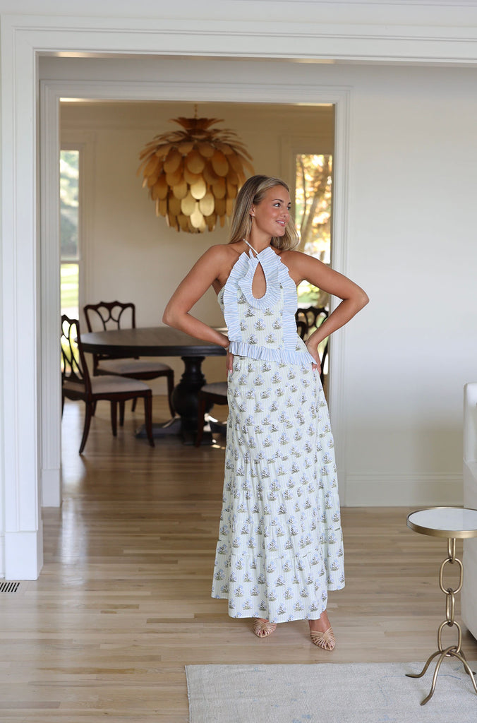Adorned with a stunning blue floral print, this original set includes an exaggerated ruffle detailed halter top and flowy maxi skirt.