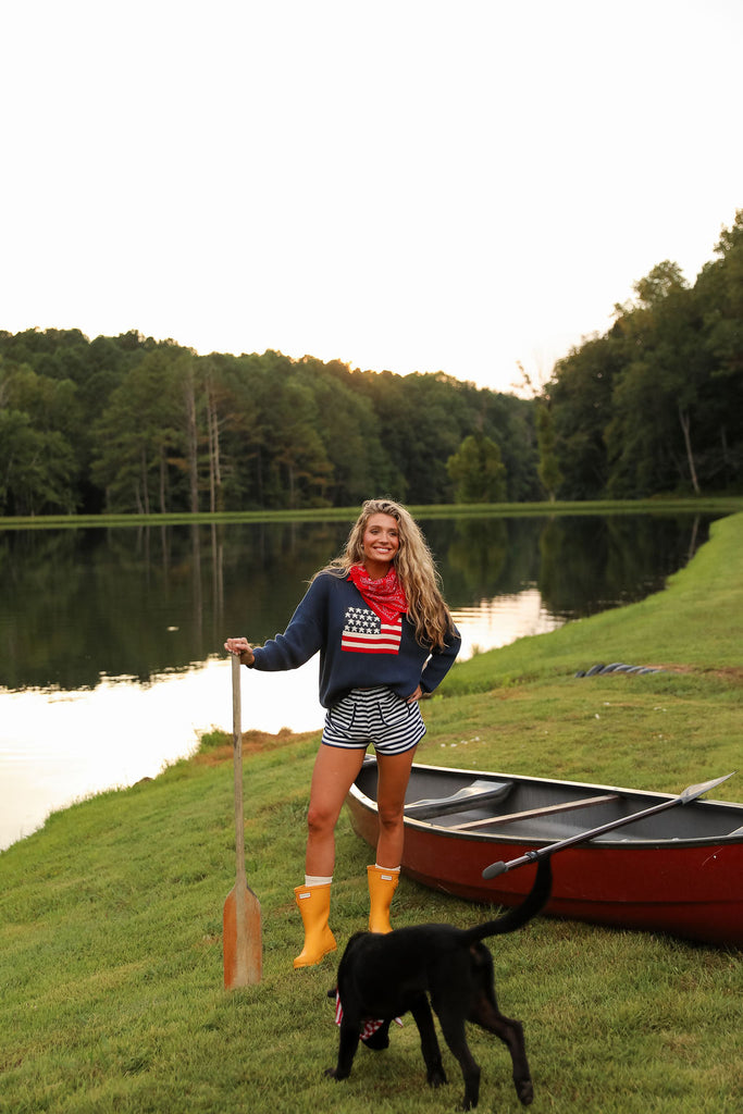 This oversized round neck sweater combines comfort with a bold statement, featuring an American flag design on the front. Available in two colors!
