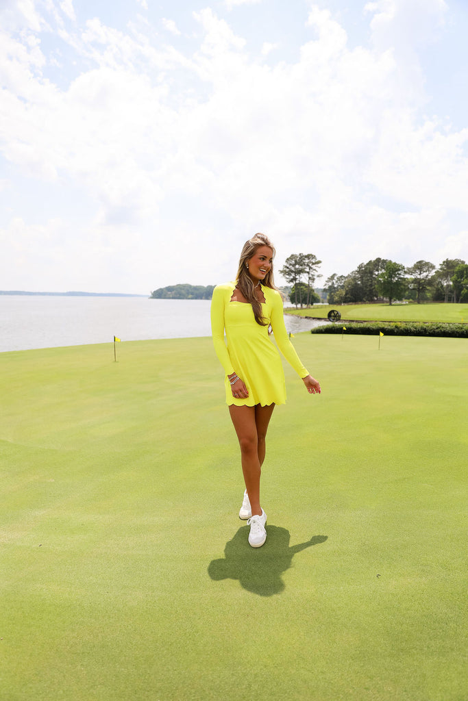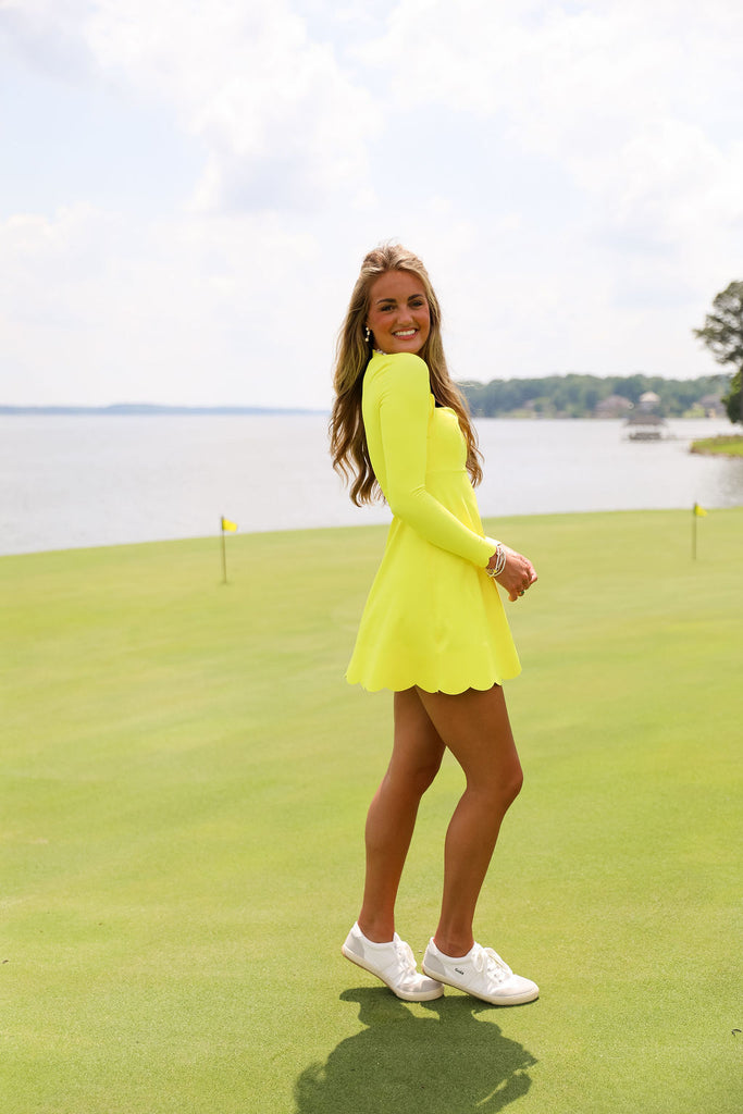 This one of a kind dress silhouette is both fitted and super soft, giving you comfort and style in one. The lightweight and smooth fabrication will keep you feeling cool; long sleeve, scalloped detail.