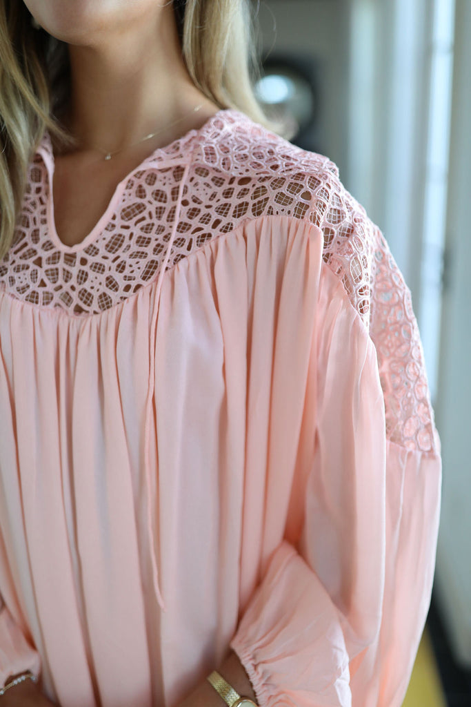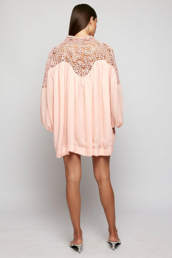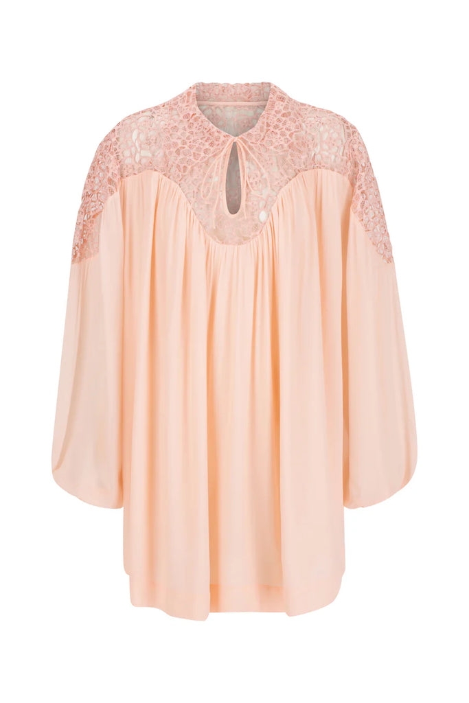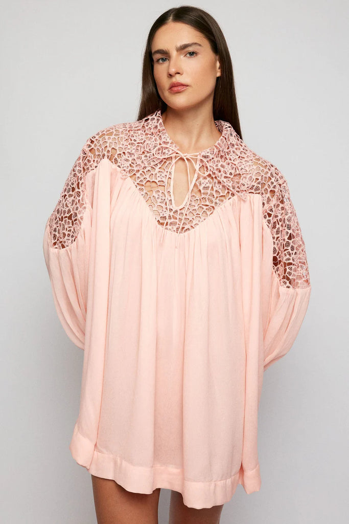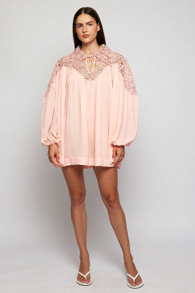 Meticulously hand-crafted by artisans in Bali, this dress showcases intricate lacework across the neckline and shoulders, highlighting its artistic design. The loose, flowy boho silhouette is complemented by voluminous sleeves, creating a unique and special piece that radiates charm and individuality. The soft pastel tone enhances its delicate aesthetic, making it ideal for memorable occasions or day to day outings. SWF
