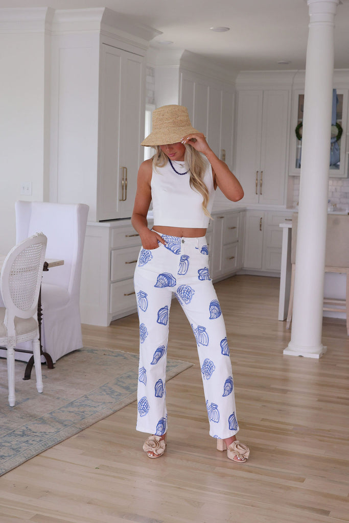 These are an essential addition to your summer wardrobe. Crafted with an off-white jean base and featuring a playful blue shell print.