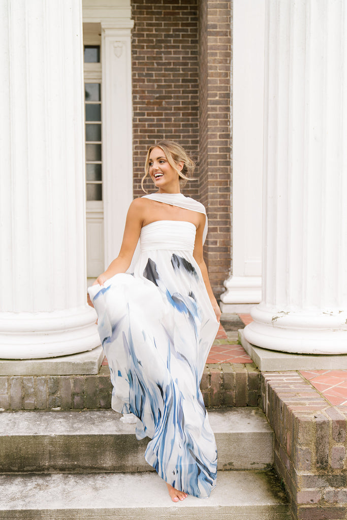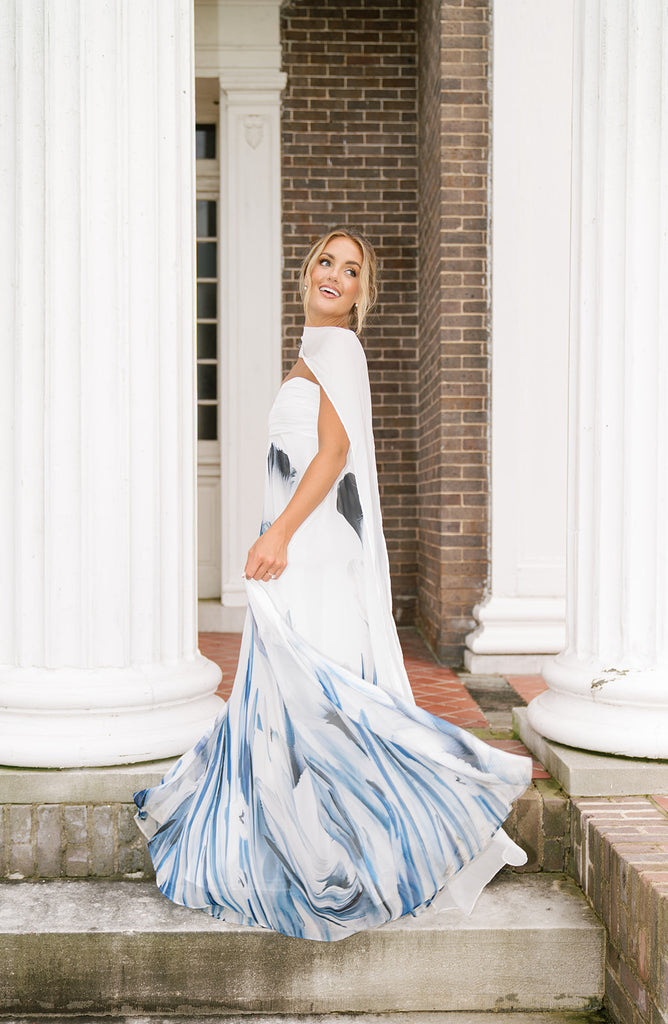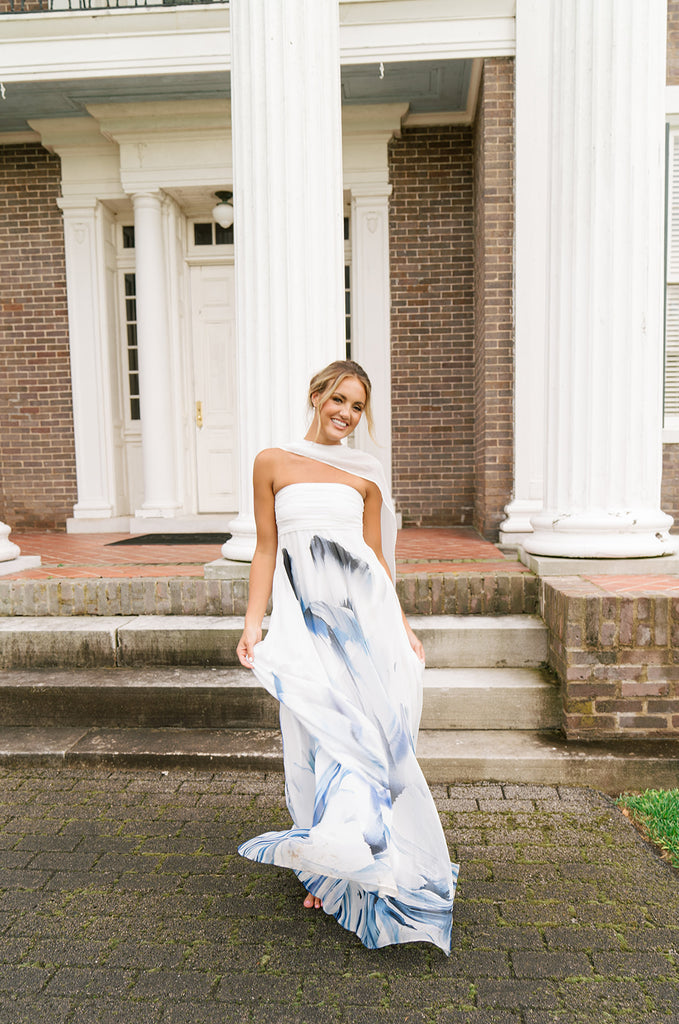 Elevate your special occasion attire with our newest gown. This strapless maxi design features an elegantly ruched bodice complemented by flowing chiffon fabric. The ensemble includes a matching elongated scarf, creating a harmonious silhouette. Available in various color options.