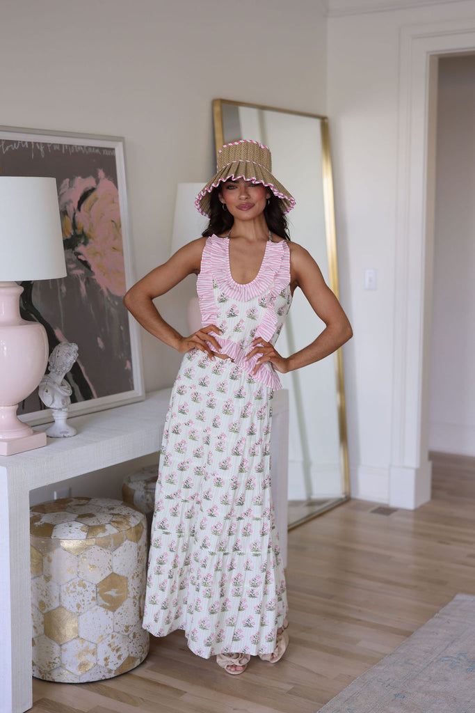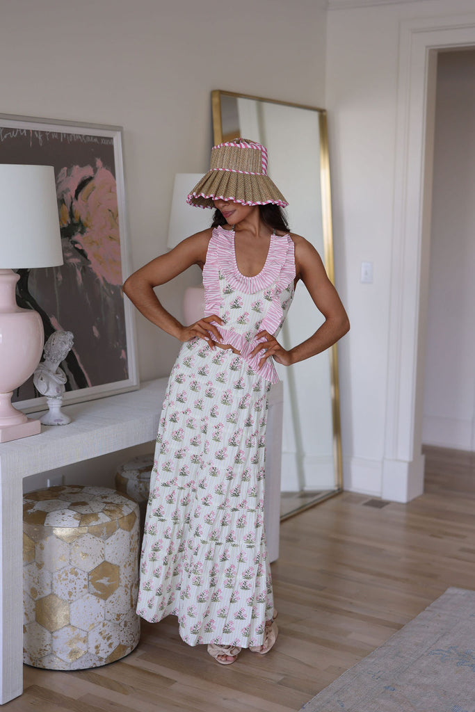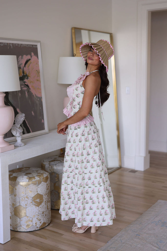Adorned with a stunning pink floral print, this original set includes an exaggerated ruffle detailed halter top and flowy maxi skirt.