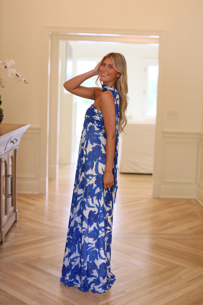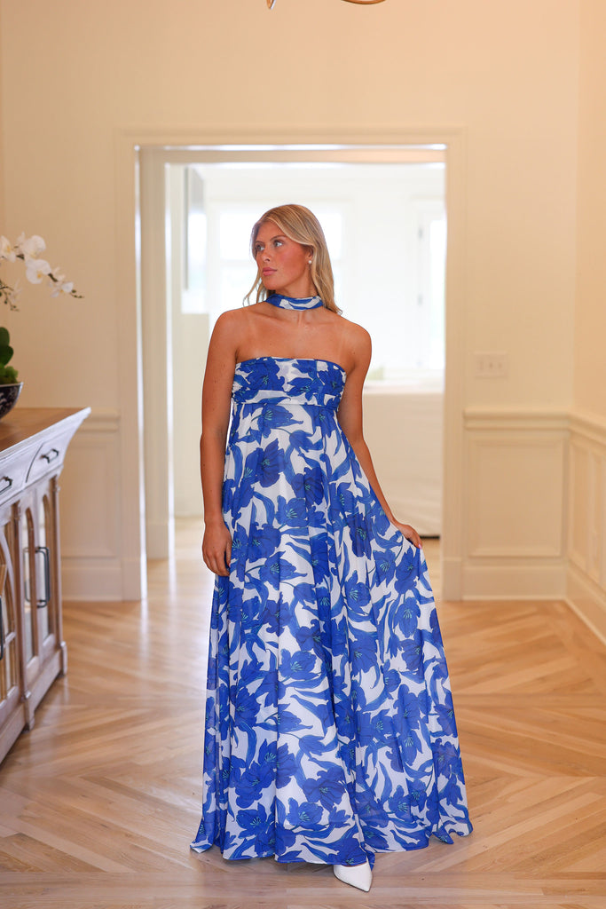 Elevate your special occasion attire with our newest gown. This strapless maxi design features an elegantly ruched bodice complemented by flowing chiffon fabric. The ensemble includes a matching elongated scarf, creating a harmonious silhouette.