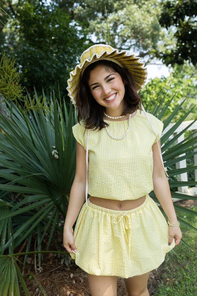This playful set features a lightweight seersucker bubble mini skirt with a charming bow tie closure, perfectly paired with a matching crop top. Ideal for sunny days, it’s the go-to outfit for a fun summer look!