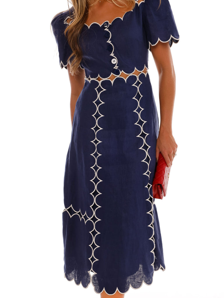 The Florence Dress in blue offers a refined silhouette with its short sleeves and elegant midi length. White piping accents the clean lines, while an open detail design adds a unique touch.