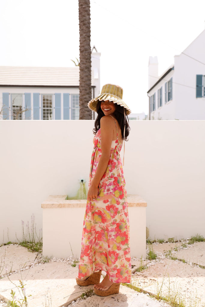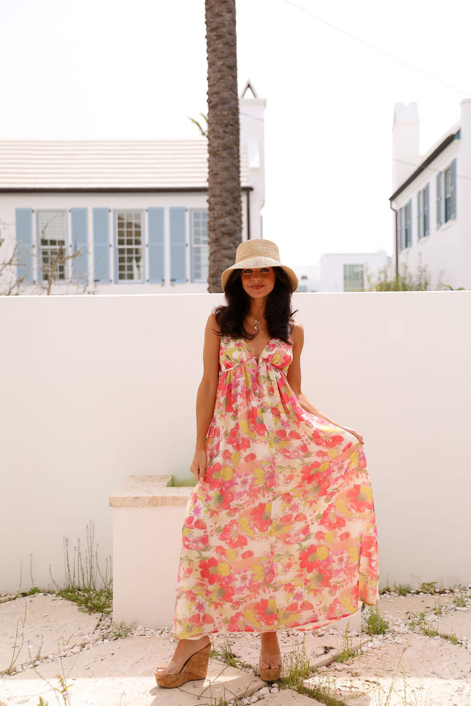 This midi dress boasts a deep v-neck design and cut out detailing. Adorned with a vibrant multi-color floral print, this dress is an artful masterpiece that will elevate your fashion game.