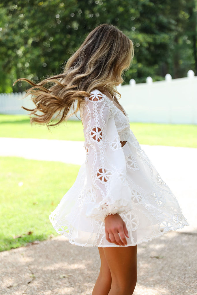 Featuring a playful deep V-neck and long eyelet sleeves that add a touch of elegance. Its mini length and daring cut-out sides and open back create a flirty, unforgettable look perfect for any fun occasion.