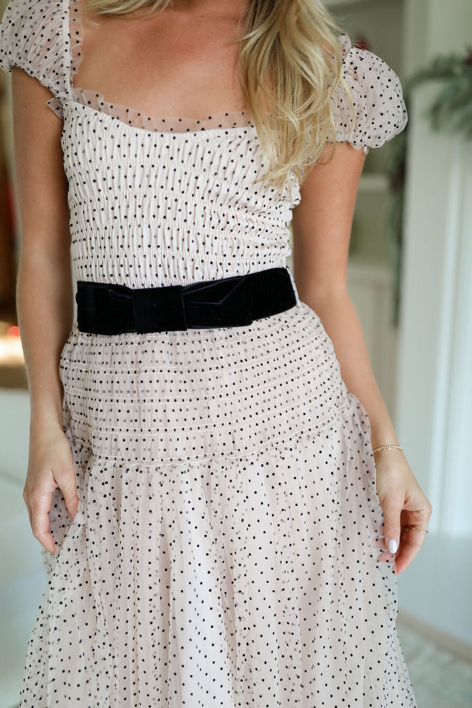 Adorned with playful polka dots and delicate mesh, this dress features a sweetheart neckline and ruffle shoulder straps, exuding sophistication. Complete the look with the included black belt.