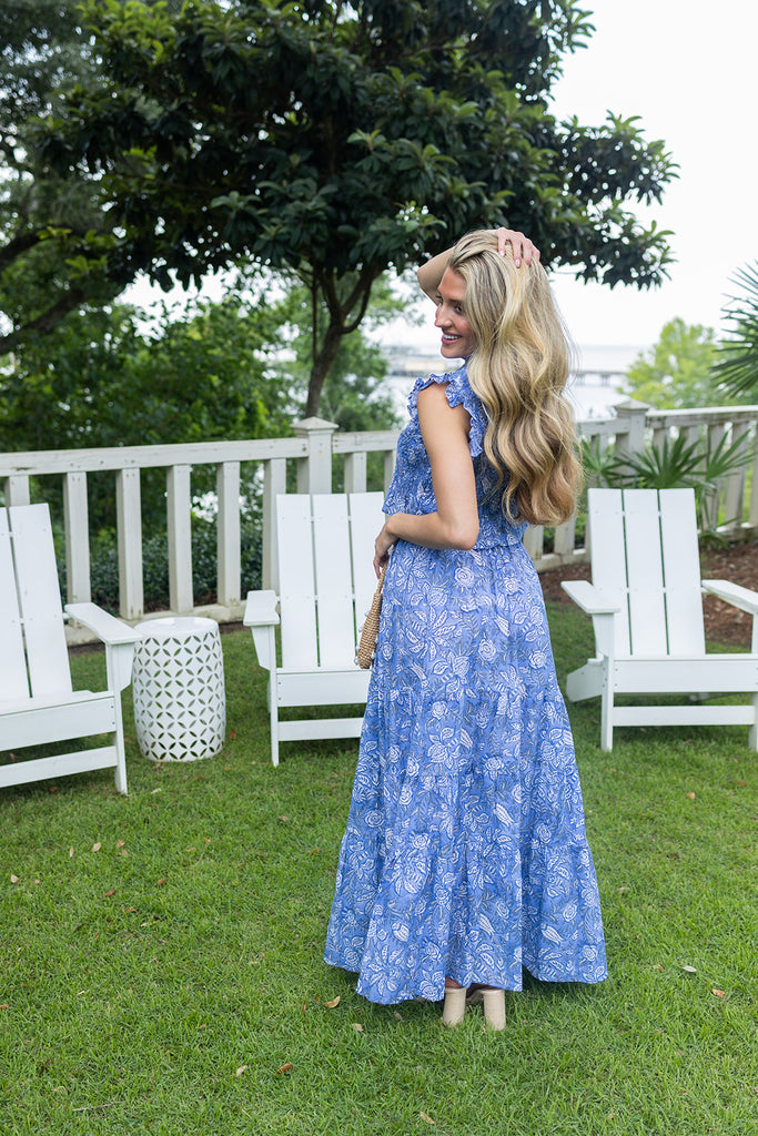 Brighten up summer days in this cheerful set! This adorable two-piece features a flutter sleeve and smocked detailed top paired with a matching flowing maxi skirt.