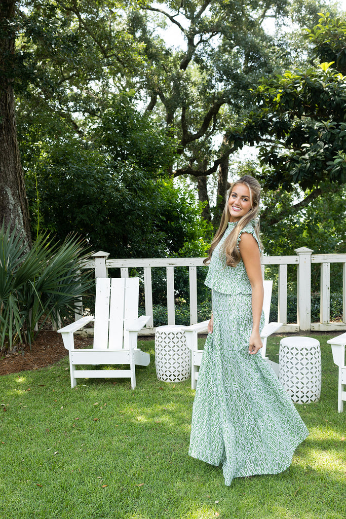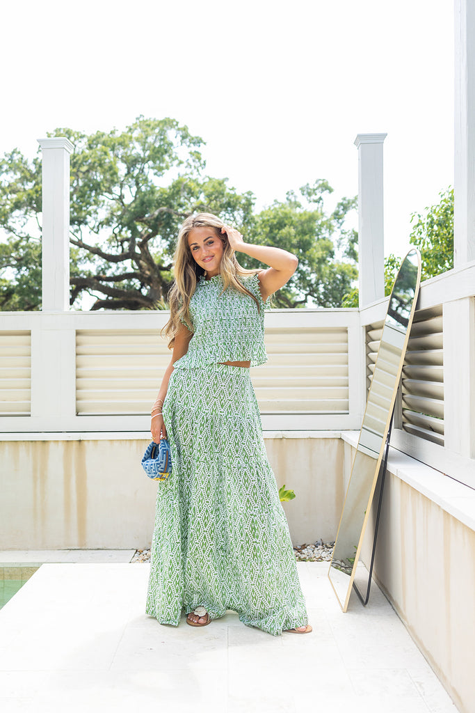 Brighten up summer days in this cheerful set! This adorable two-piece features a flutter sleeve and smocked detailed top paired with a matching flowing maxi skirt.