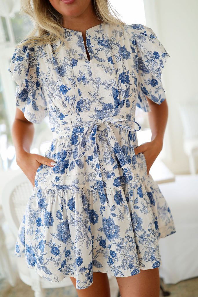 Elevate your summer ensemble with this mini in a refreshing blue hue. Featuring delicate flutter sleeves and a sophisticated tie waist that creates a flattering silhouette. The flowy skirted bottom adds graceful movement, making this piece perfect for warm-weather events!