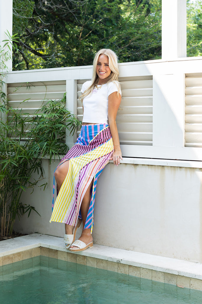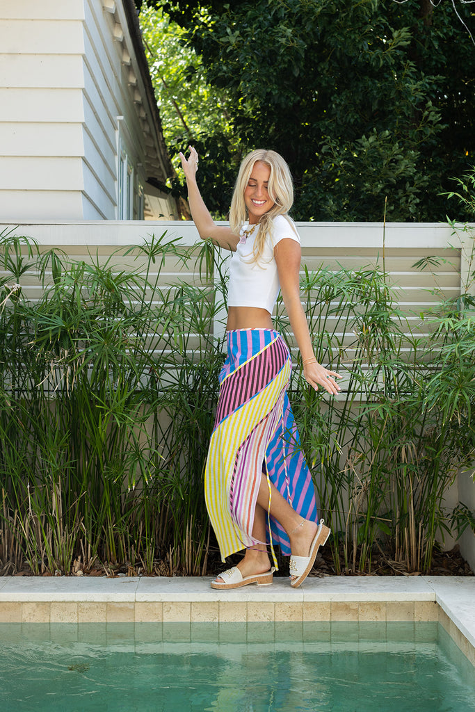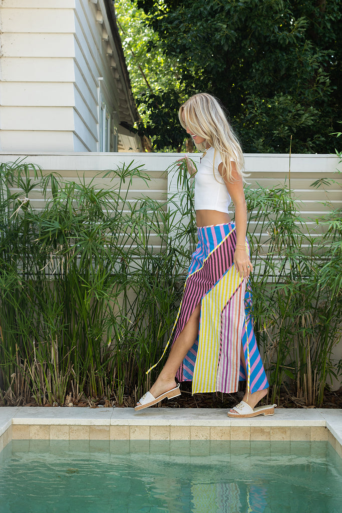 The Souci Skirt is a striking maxi that’s all about movement, color, and confidence. With a bold patchwork of stripes in pink, blue, yellow, and cream, its asymmetrical cut and high side slit create an ultra-flattering silhouette that flows with ease. A tie detail adds charm and adjustability. Pair it with the Julieta Top for a full vibrant look, or tone it down with a crisp white blouse.