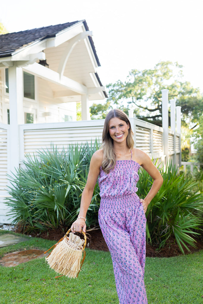 This jumpsuit bursts with vibrant purple and pink hues, perfect for adding a pop of fun to your wardrobe. Its comfortable fit lets you move freely while making a bold, cheerful statement wherever you go.