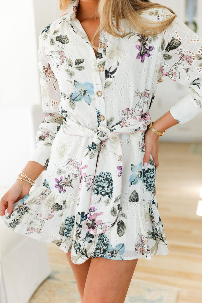 This playful mini dress features a charming natural multicolor floral print, perfect for sunny days. Accompanied by long sleeves, collared neckline, and belted waist.