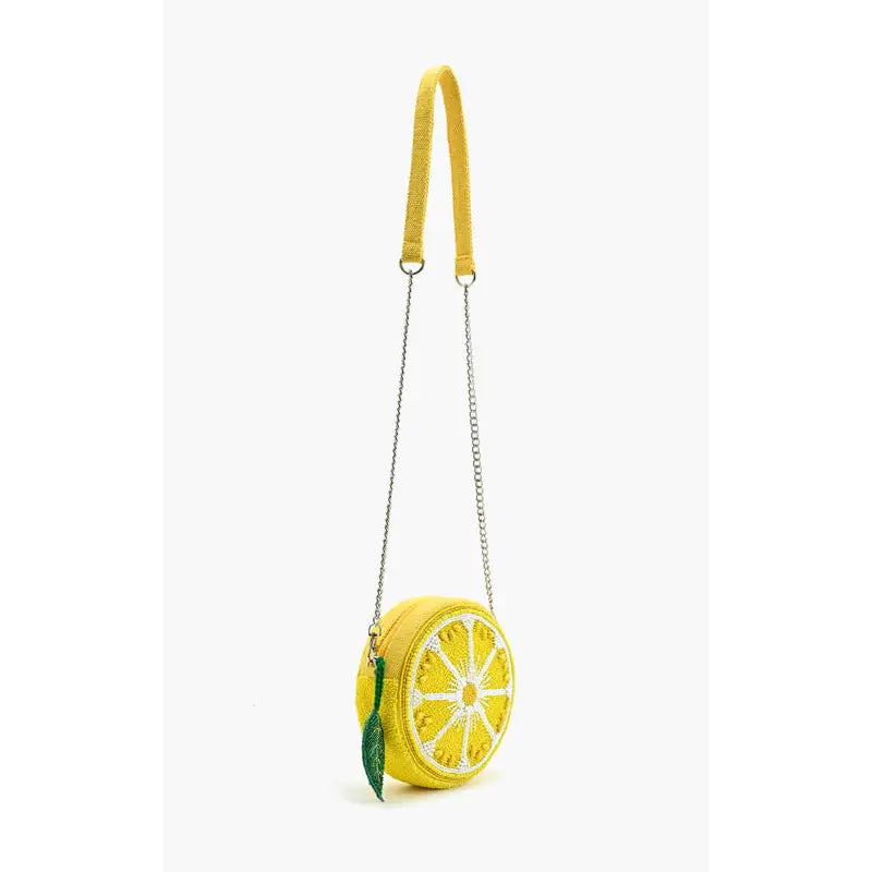 - Designed for the bold and the beautiful, this quirky bag is dripping in lemon slice designs that scream ‘main character energy.’ Made from handwoven jacquard with sparkling lurex details, it’s all about that perfect pop to your fit. And, there’s more! The detachable chain shoulder strap gives you all the versatility, and the main compartment with a zip closure (featuring a playful embellished leaf puller) is both cute and secure. Inside, it’s all lined up for that polished finish.