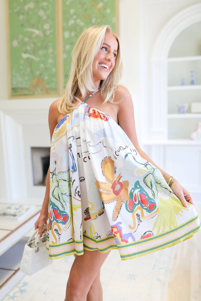 Crafted with a halter neckline, this mini dress exudes charm. With a gorgeous pattern, this dress is sure to make a statement.