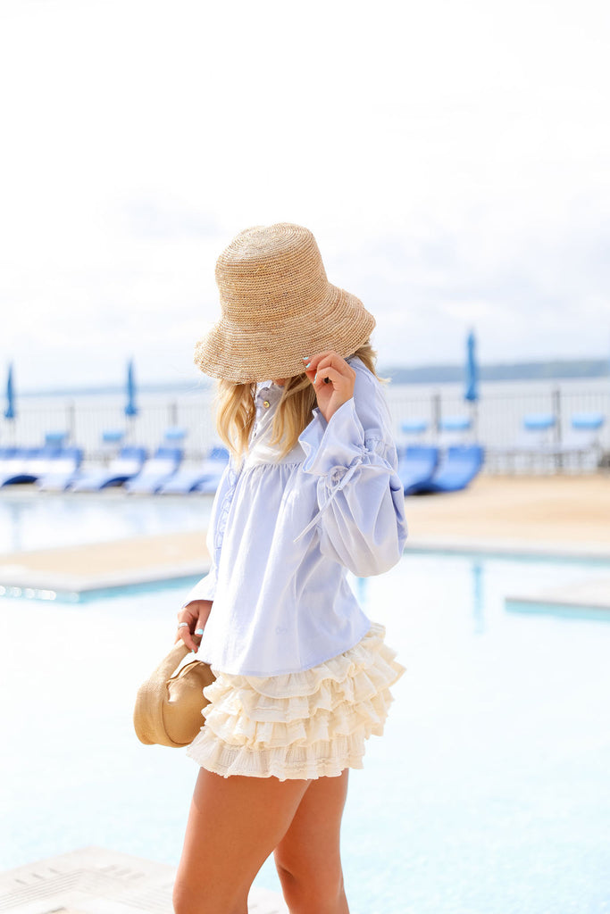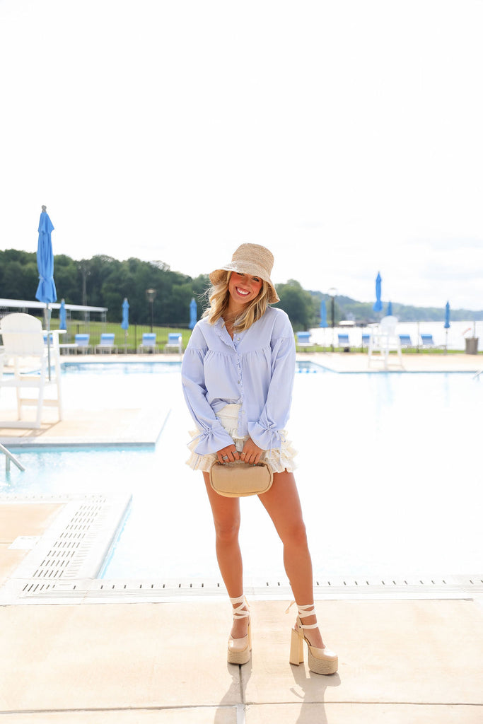 This long sleeve top features delicate ruffle and button front detailing.
