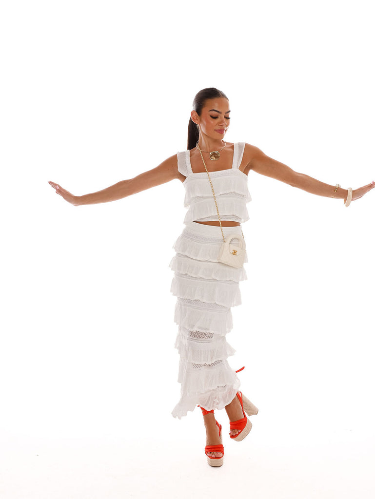 We are loving this tiered ruffle knit top with the matching midi skirt! Perfect for summer!