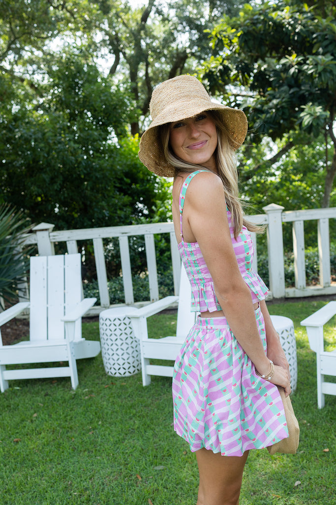 Featuring an adorable floral multicolor print, the crop top showcases an open detail. The matching skirt completes the look, making it perfect for sunny days and fun outings.
