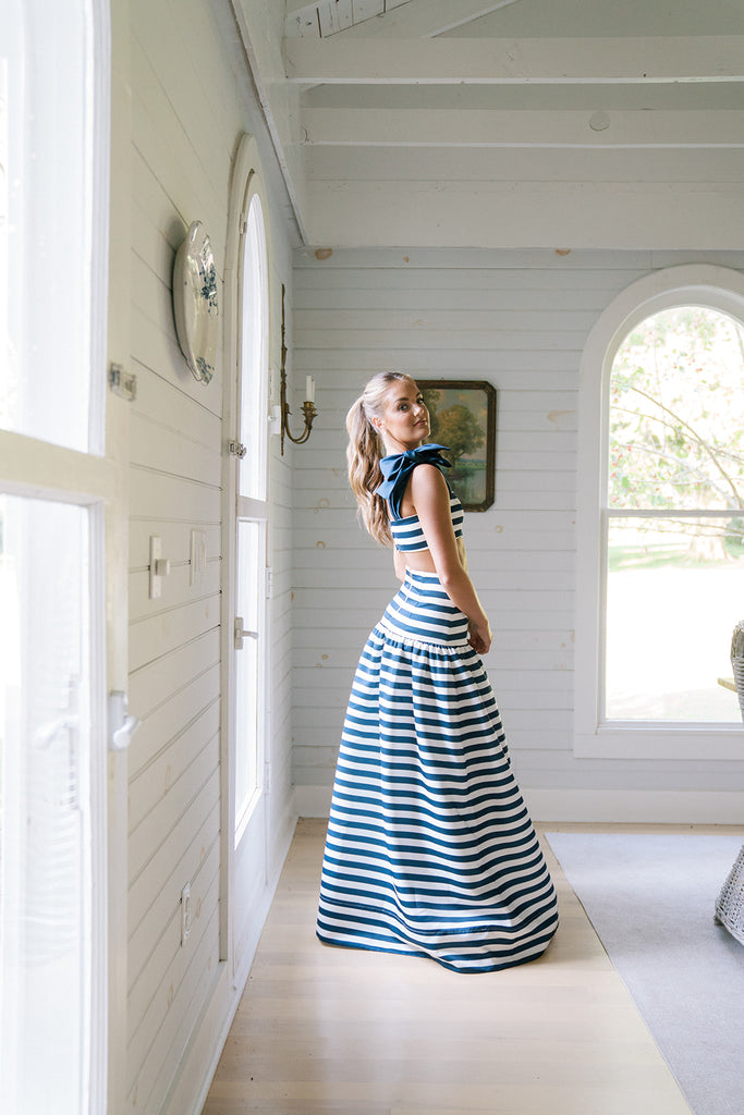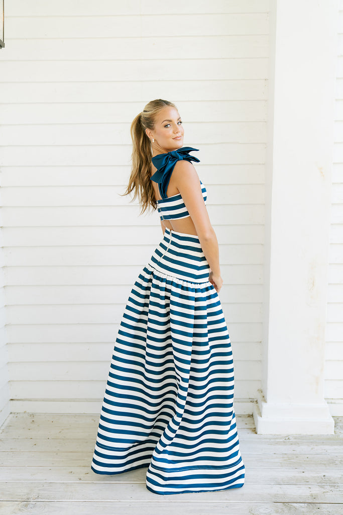 This two-piece set features a tube top with an exaggerated bow shoulder tie, paired with a matching maxi skirt in bold navy and white stripes.