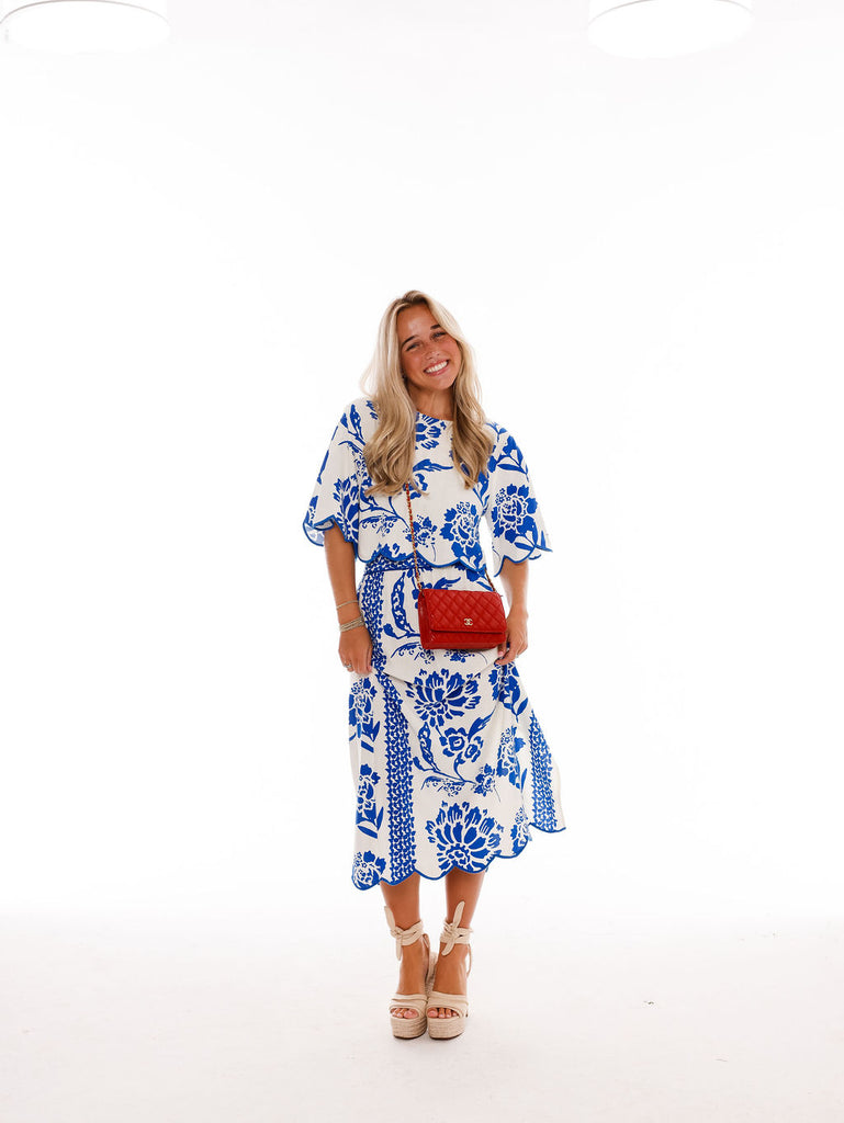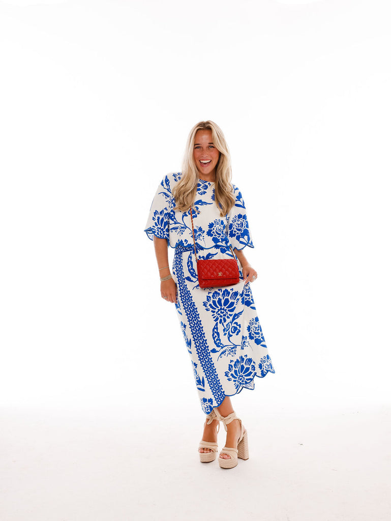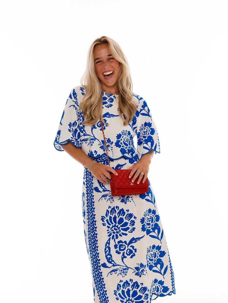Made from 100% cotton, this set features a short sleeve top with a wavy hem and a matching maxi skirt. Perfect for a playful and stylish look!