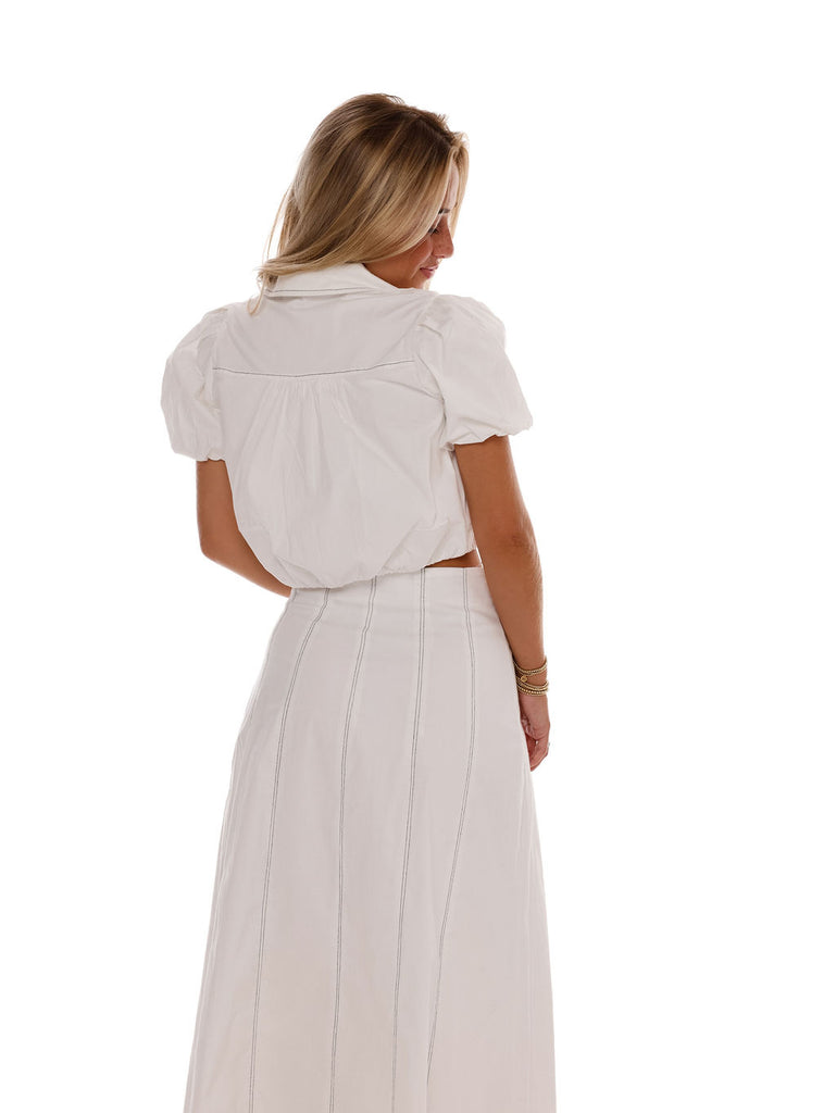 An adorable crop top, featuring a stylish collar, playful puff sleeves, and a unique pocket detail. Pairs perfectly with the matching skirt or shorts (sold separately). We love the contrast stitching!