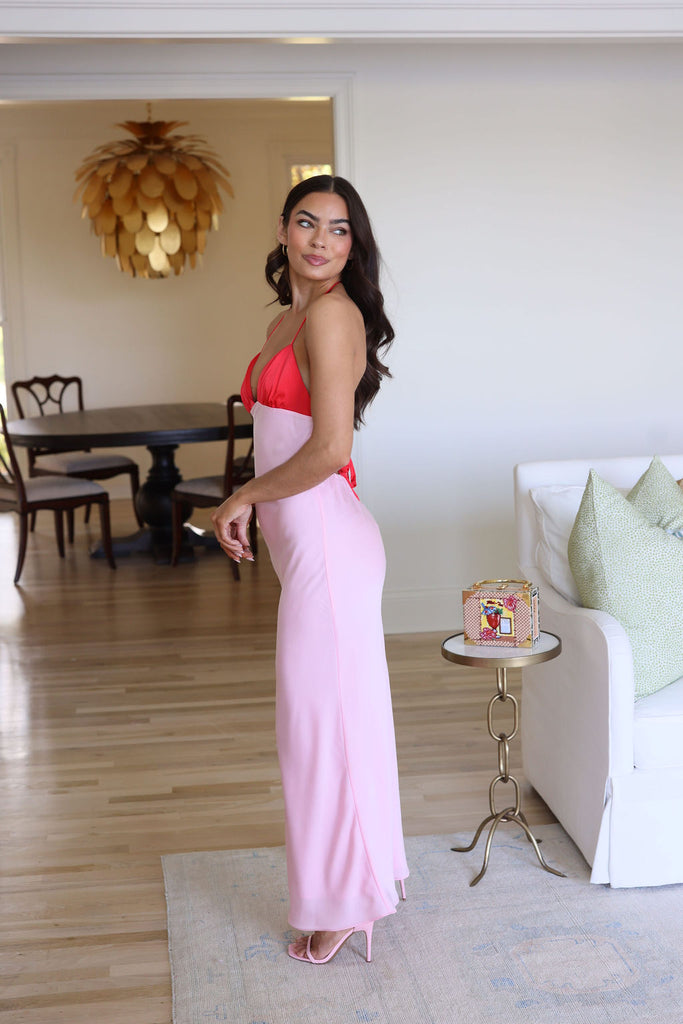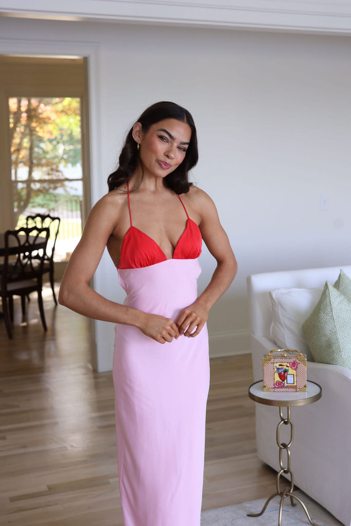 The Wolfe Dress is a playful take on a spring-summer classic, elevated with bold contrast detailing. This full-length silhouette features a soft A-line shape that beautifully drapes over the body. The adjustable halter ties and an open back creates a feminine, captivating finish.