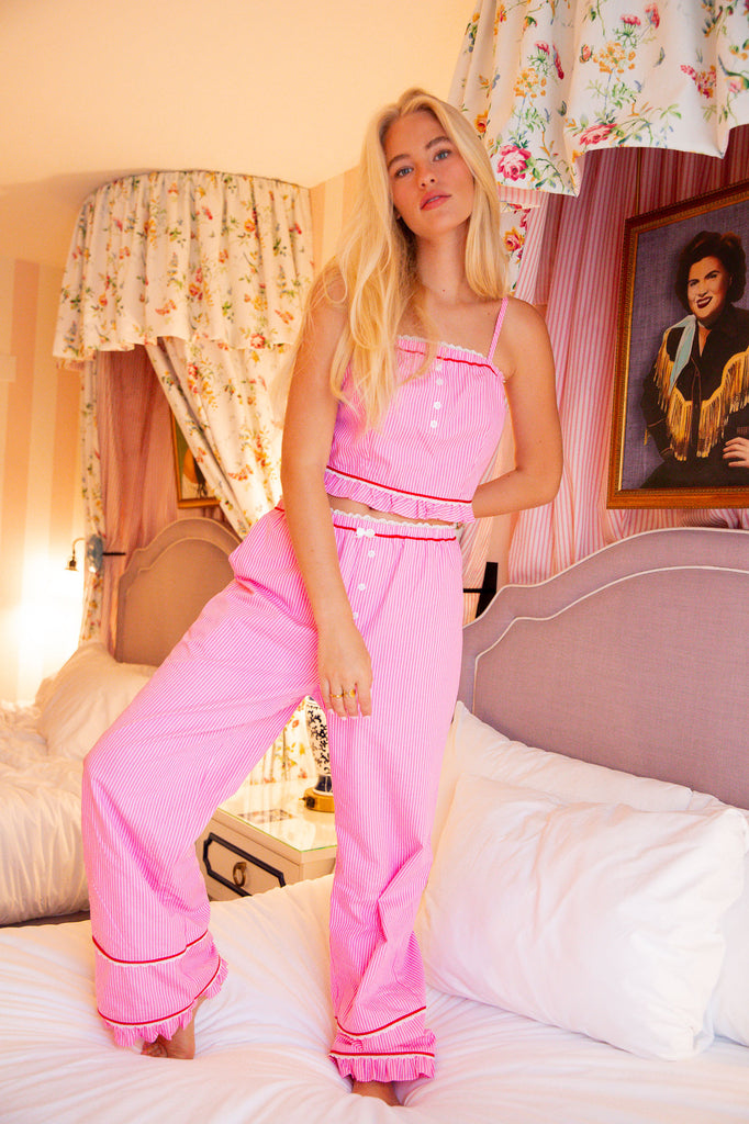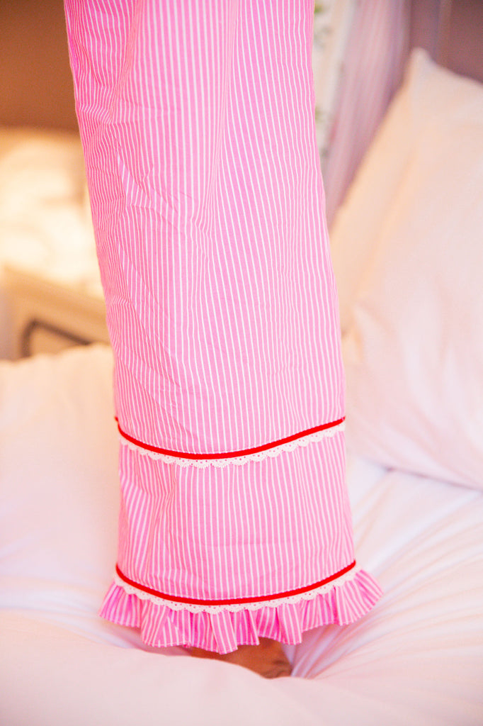 Drift off in darling style with these pinstripe pajama pants, made to feel as sweet as they look. Featuring dainty lace trim, a ruffle hem, and charming button details, they bring a soft, feminine touch. Available in two dreamy colors, these comfy-cut pants pair perfectly with the matching sleep top.