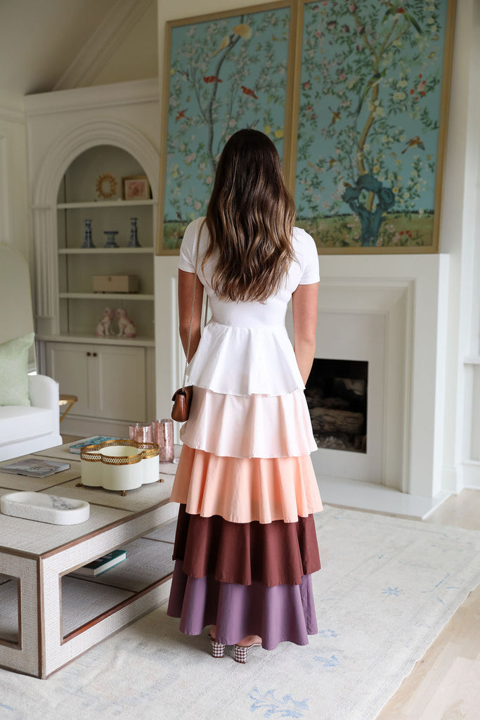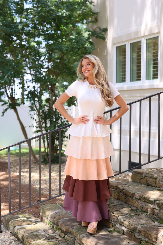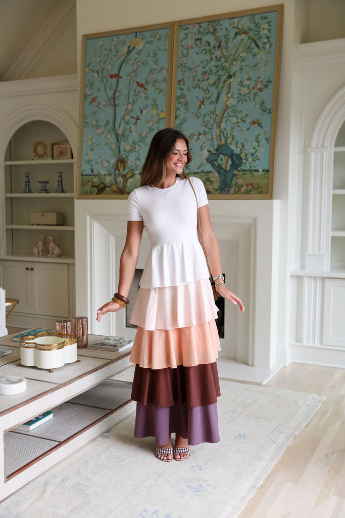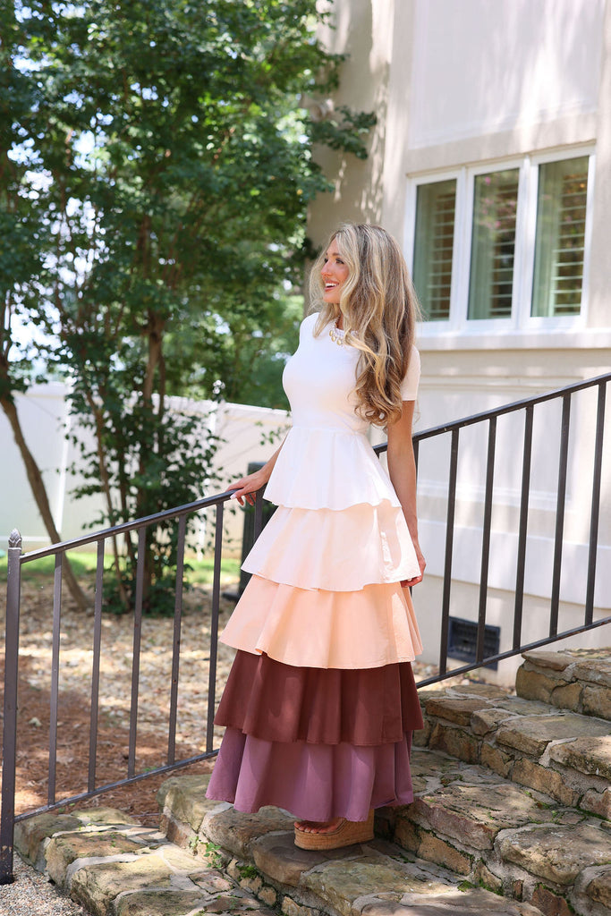 Featuring a fitted cap sleeve top paired with a lively multi-tiered ruffle skirt. We love the multi color hues!