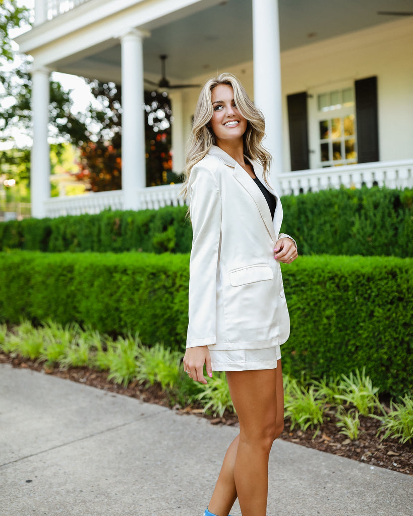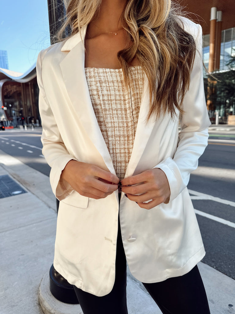 A timeless classic, menswear-inspired design defines this tailored blazer featuring a light weight satin fabric with a notch lapel. Blazer has shoulder pads. Model is a US size 2, wearing a small.