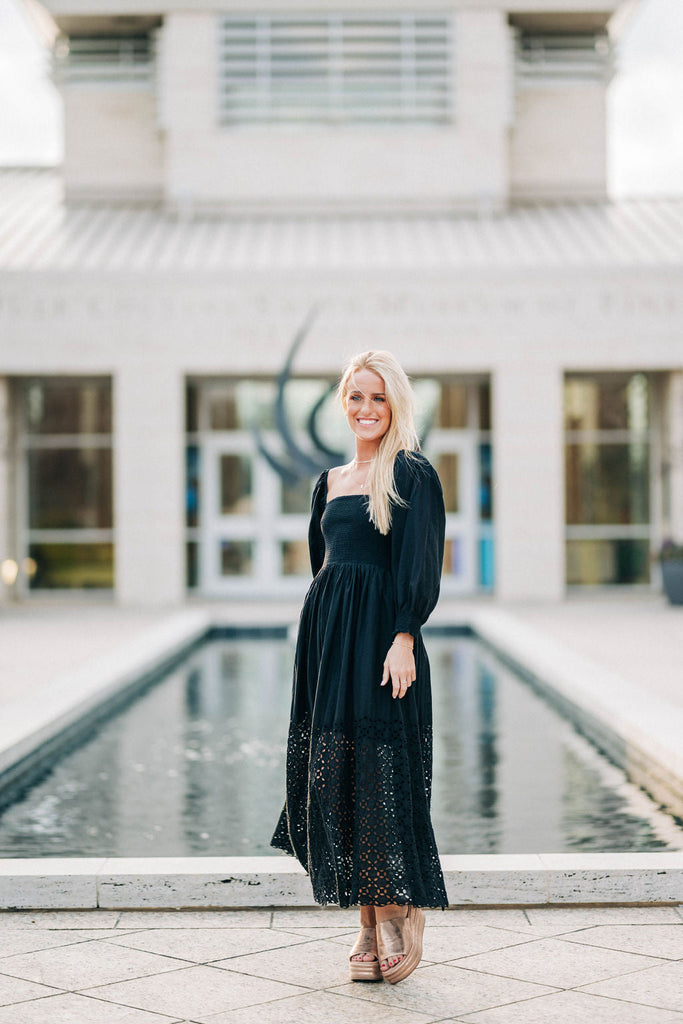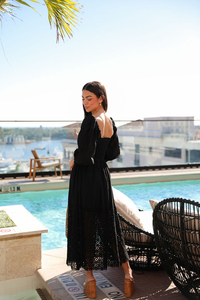 We found your new favorite everyday dress. This feminine midi is featured in a soft cotton fabrication and billowy silhouette with smocking at the bodice and eyelet-inspired detailing.